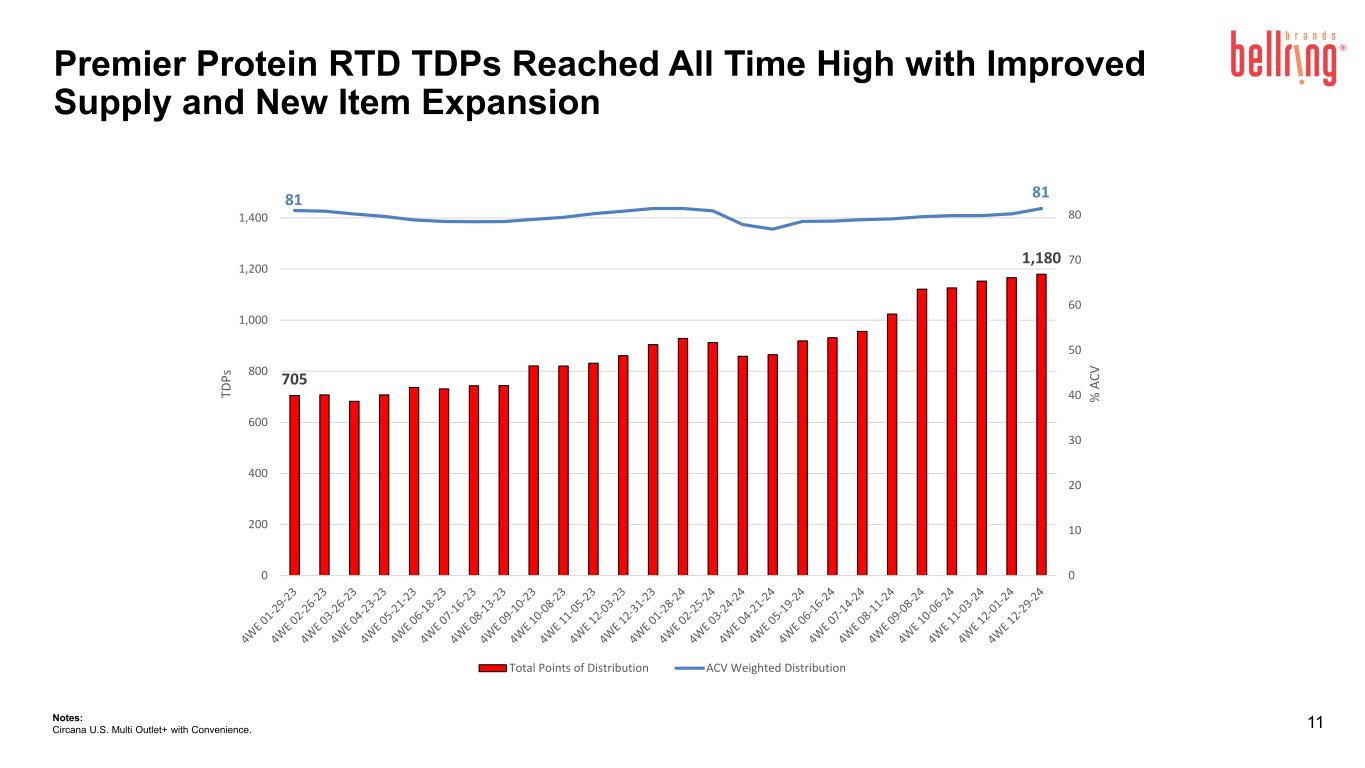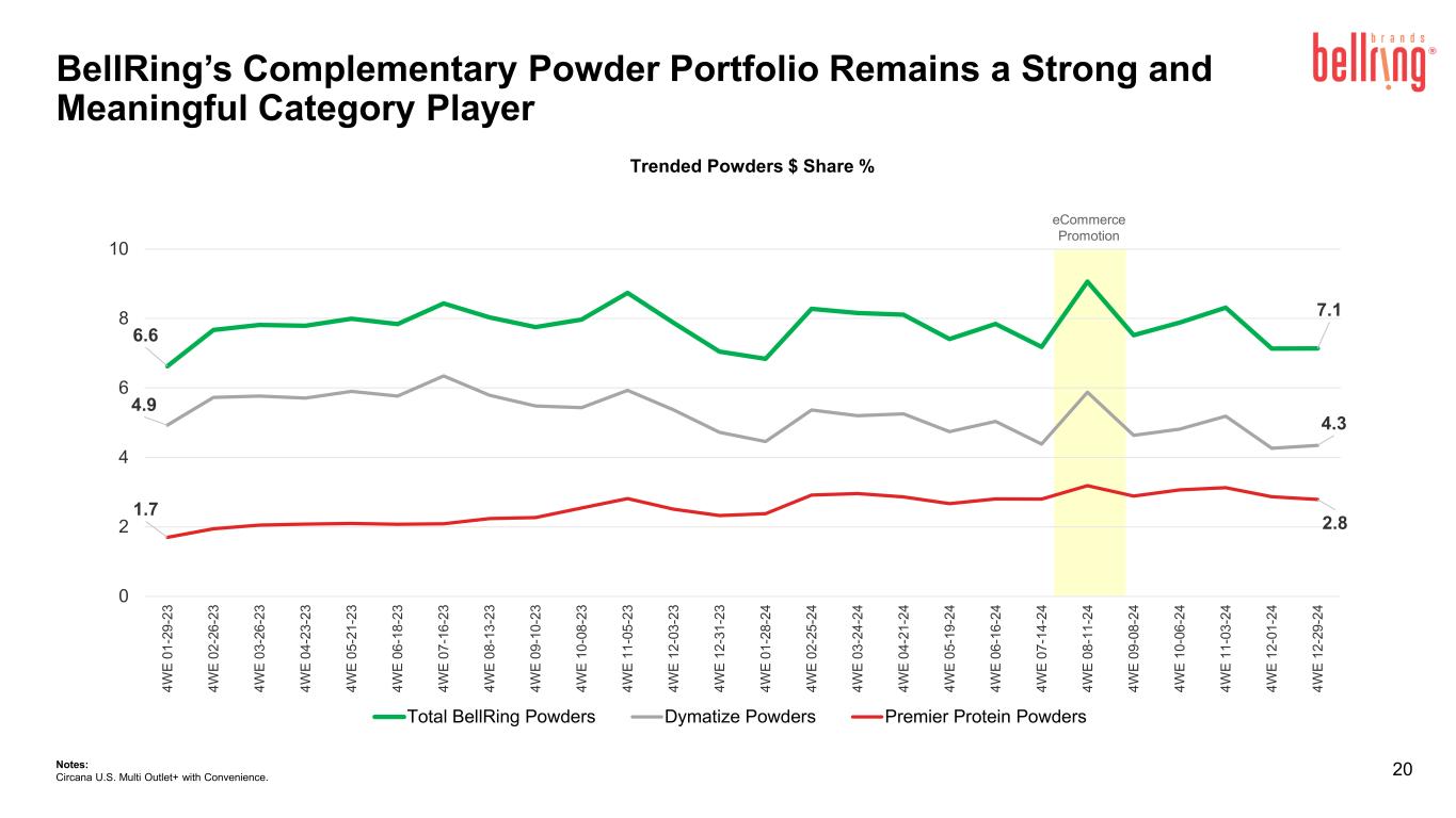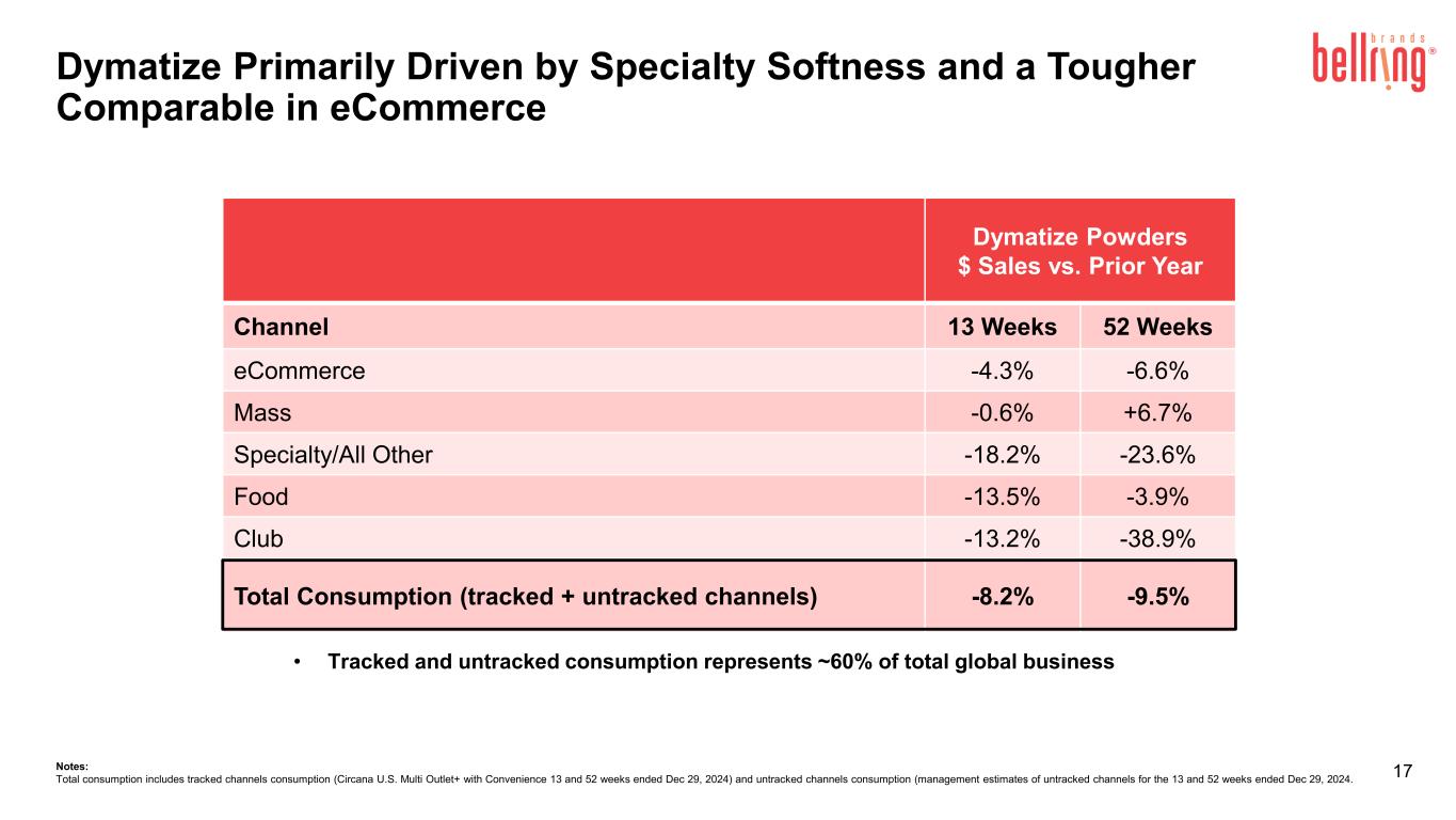 2024年12月29日に終了した13週間のPremier ProteinシェイクおよびPremier Proteinパウダー製品のドル消費量は、前年同期と比較してそれぞれ23.4%および24.4%増加し、Dymatize製品は8.2%減少した(Circana United States(「米国」)のMulti Outlet Plus with Convenienceおよび未追跡チャネルの経営陣推定値を含む)。消費指標に関する追加情報については、ベルリングのウェブサイトの投資家向け情報セクションからアクセスできる補足資料をご覧ください。