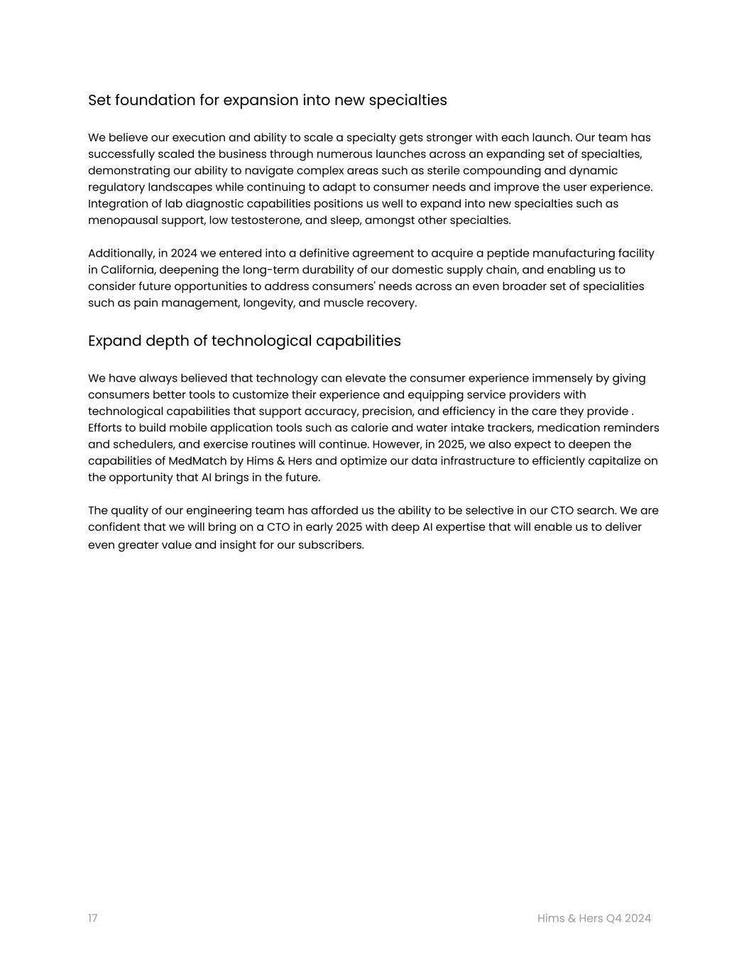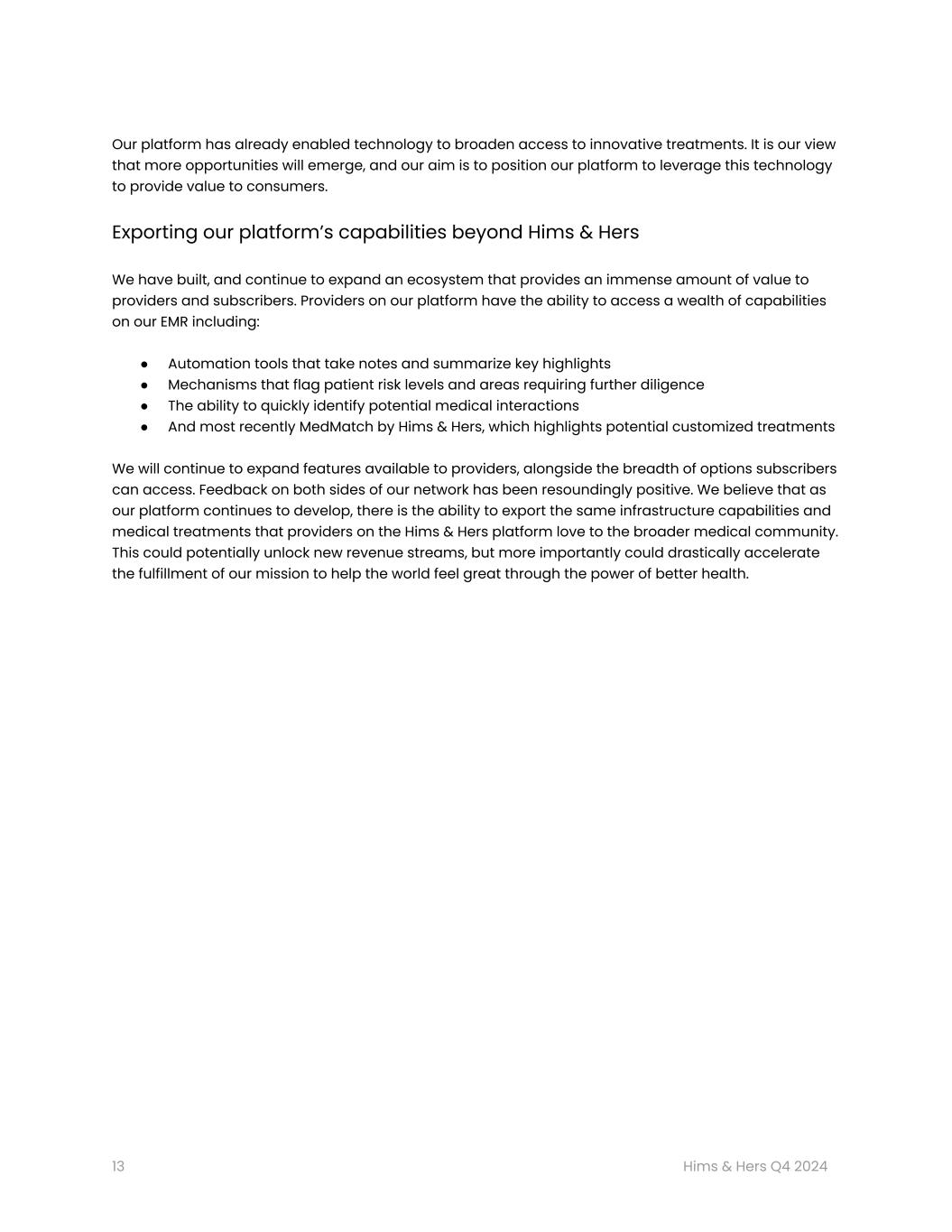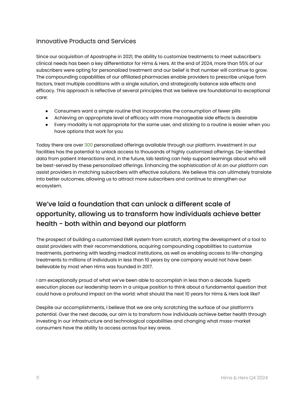 「2024年はヒムズ&ハーズにとって素晴らしい年でした。従来のヘルスケアシステムとは異なるパーソナライゼーションとテクノロジーを活用したプラットフォームを構築し続けているからです。「現在、200万人以上の加入者が、より良い健康への旅を支援するためにヒムズ&ハーズを信頼しています。今後数年間で、より包括的な治療法、無制限のフォローアップ・サポートを常態化する技術、そして最終的にはヒムズ&ハーズ以外にも輸出できるツールによって、個人が健康を改善する方法をさらに変革し、さらに多くのアメリカ人がこのケアにアクセスできるようになると期待しています。私たちは、これらの分野に継続的に注力することで、国内のすべての家庭が、便利で手頃な価格で、質の高い精密医療を受けられるようになると考えており、2025年が、この次世代医療のビジョンに向けた新たなエキサイティングな一歩となることを期待しています。"