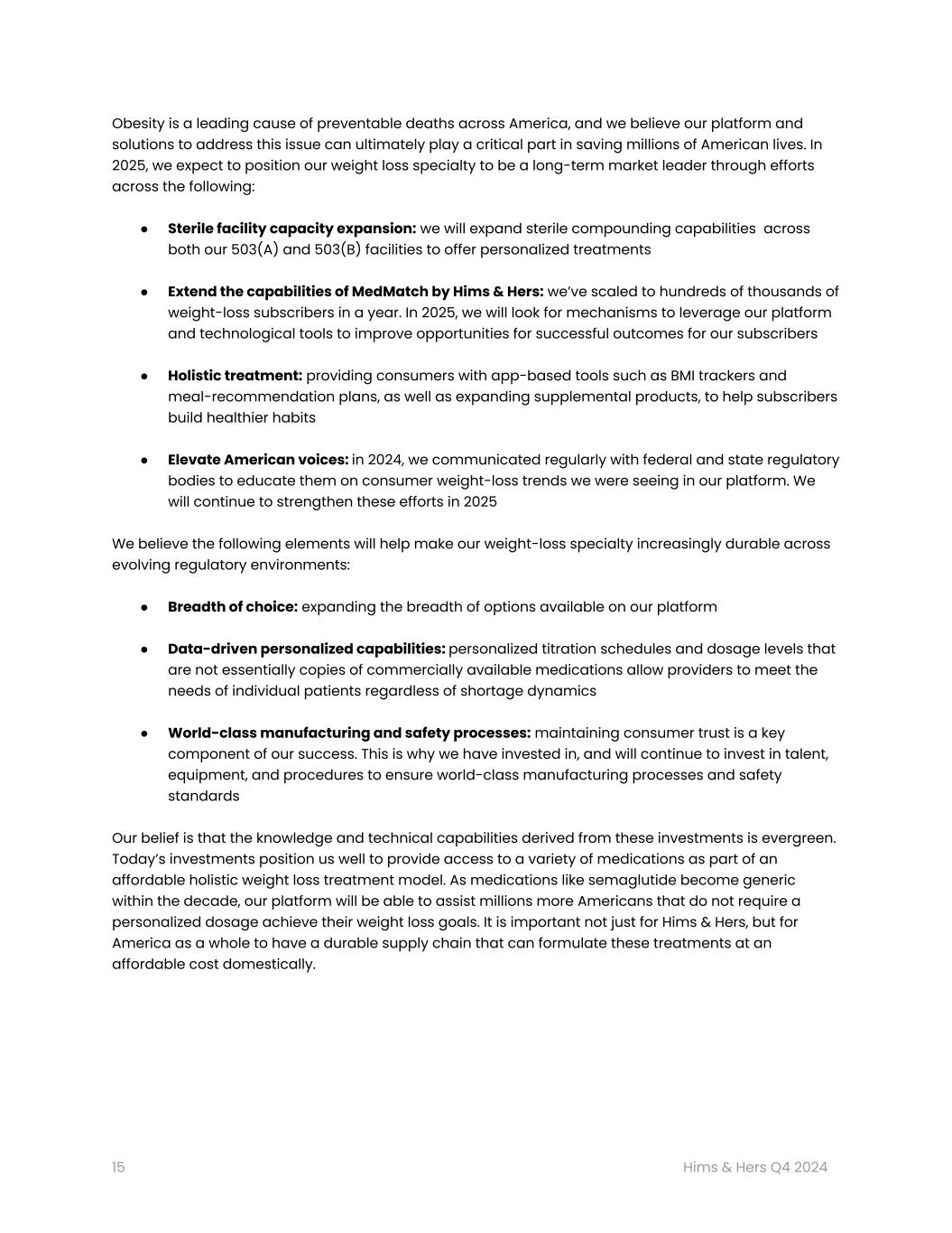 CFOのYemi Okupeは次のように述べている。「私たちが経験している成功は、私たちの各専門分野にわたって、質の高い個別化医療へのアクセスを民主化する能力を向上させていることの直接的な反映です。GLP-1製剤を除く2024年の売上高は前年比43%増の12億ドル超となり、2025年の売上高目標を1年早く達成しました。連結売上高は前年比69%増の15億ドル近くに達し、これは当社の減量製品が引き続きこうしたトレンドを加速させるものであるためです。これは、当社のプラットフォームが新たな専門分野に参入し、急速に規模を拡大する能力を高めていることを示すものであり、当社が驚異的な効率で規模を拡大できる一連の中核的機能を構築していることをさらに確信させるものだと考えています。このような進化は、長期的な収益目標に向かって前進すると同時に、数千万人の人々にサービスを提供することを可能にします。