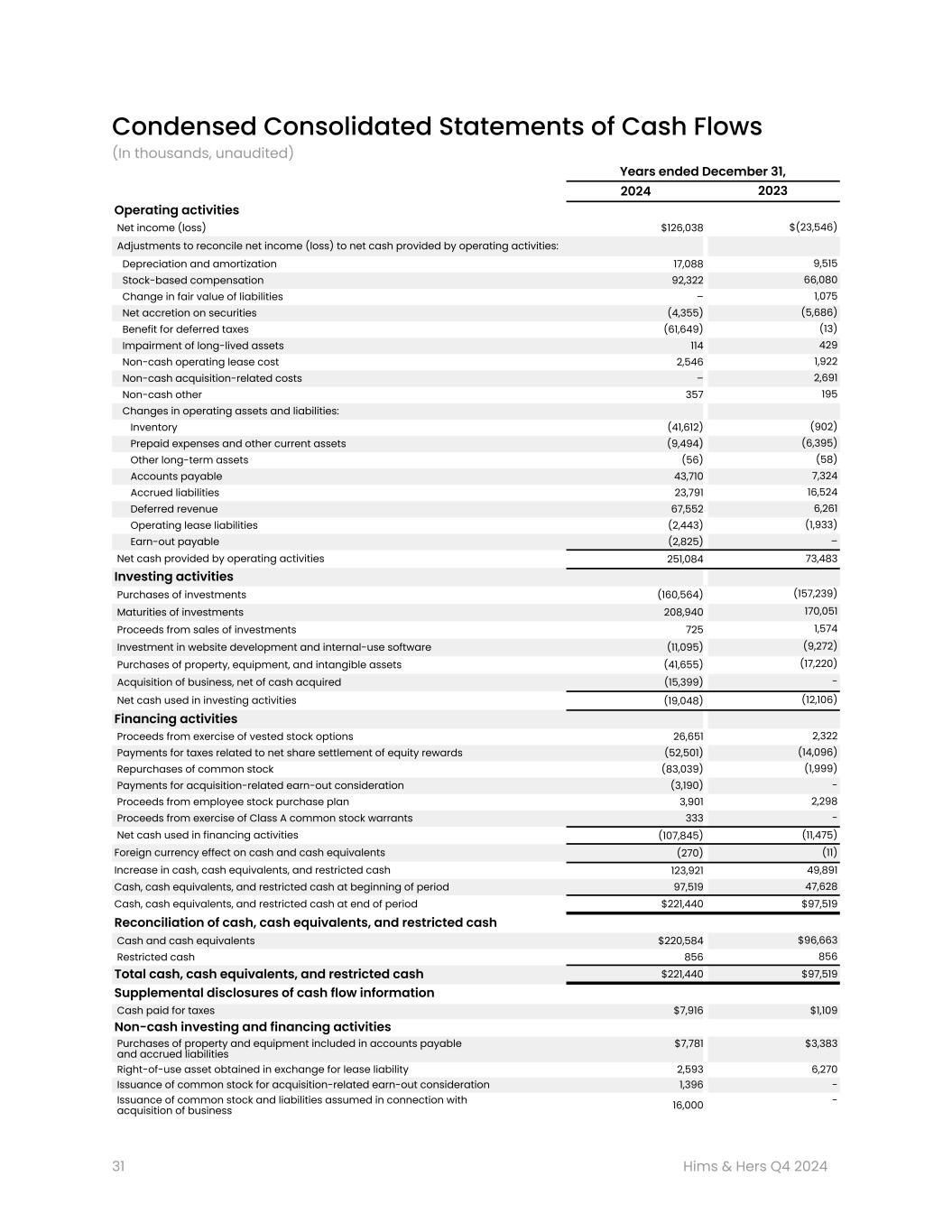 -営業活動による純キャッシュは、2023年12月31日終了年度の7,350万ドルに対し、2024年12月31日終了年度は2億5,110万ドルであった。
