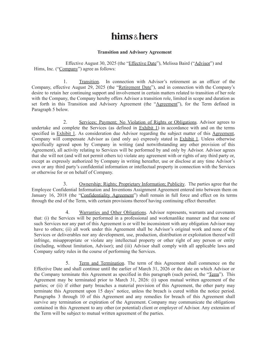 Transition and Advisory Agreement Effective August 30, 2025 (the “Effective Date”), Melissa Baird (“Advisor”) and Hims, Inc. (“Company”) agree as follows: 1. Transition. In connection with Advisor’s retirement as an officer of the Company, effective August 29, 2025 (the “Retirement Date”), and in connection with the Company’s desire to retain her continuing support and involvement in certain matters related to transition of her role with the Company, the Company hereby offers Advisor a transition role, limited in scope and duration as set forth in this Transition and Advisory Agreement (the “Agreement”), for the Term defined in Paragraph 5 below. 2. Services; Payment; No Violation of Rights or Obligations. Advisor agrees to undertake and complete the Services (as defined in Exhibit 1) in accordance with and on the terms specified in Exhibit 1. As consideration due Advisor regarding the subject matter of this Agreement, Company will compensate Advisor as (and only as) expressly stated in Exhibit 1. Unless otherwise specifically agreed upon by Company in writing (and notwithstanding any other provision of this Agreement), all activity relating to Services will be performed by and only by Advisor. Advisor agrees that she will not (and will not permit others to) violate any agreement with or rights of any third party or, except as expressly authorized by Company in writing hereafter, use or disclose at any time Advisor’s own or any third party’s confidential information or intellectual property in connection with the Services or otherwise for or on behalf of Company. 3. Ownership; Rights; Proprietary Information; Publicity. The parties agree that the Employee Confidential Information and Inventions Assignment Agreement entered into between them on January 16, 2018 (the “Confidentiality Agreement”) shall remain in full force and effect on its terms through the end of the Term, with certain provisions thereof having continuing effect thereafter. 4. Warranties and Other Obligations. Advisor represents, warrants and covenants that: (i) the Services will be performed in a professional and workmanlike manner and that none of such Services nor any part of this Agreement is or will be inconsistent with any obligation Advisor may have to others; (ii) all work under this Agreement shall be Advisor’s original work and none of the Services or deliverables nor any development, use, production, distribution or exploitation thereof will infringe, misappropriate or violate any intellectual property or other right of any person or entity (including, without limitation, Advisor); and (iii) Advisor shall comply with all applicable laws and Company safety rules in the course of performing the Services. 5. Term and Termination. The term of this Agreement shall commence on the Effective Date and shall continue until the earlier of March 31, 2026 or the date on which Advisor or the Company terminate this Agreement as specified in this paragraph (such period, the “Term”). This Agreement may be terminated prior to March 31, 2026: (i) upon mutual written agreement of the parties; or (ii) if either party breaches a material provision of this Agreement, the other party may terminate this Agreement upon 15 days’ notice, unless the breach is cured within the notice period. Paragraphs 3 through 10 of this Agreement and any remedies for breach of this Agreement shall survive any termination or expiration of the Agreement. Company may communicate the obligations contained in this Agreement to any other (or potential) client or employer of Advisor. Any extension of the Term will be subject to mutual written agreement of the parties.