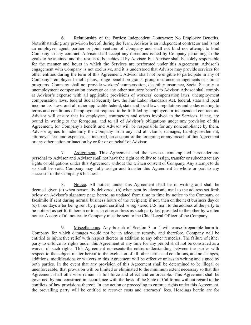 6. Relationship of the Parties; Independent Contractor; No Employee Benefits. Notwithstanding any provision hereof, during the Term, Advisor is an independent contractor and is not an employee, agent, partner or joint venturer of Company and shall not bind nor attempt to bind Company to any contract. Advisor shall accept any directions issued by Company pertaining to the goals to be attained and the results to be achieved by Advisor, but Advisor shall be solely responsible for the manner and hours in which the Services are performed under this Agreement. Advisor’s engagement with Company is not exclusive, and it is understood that Advisor may provide services for other entities during the term of this Agreement. Advisor shall not be eligible to participate in any of Company’s employee benefit plans, fringe benefit programs, group insurance arrangements or similar programs. Company shall not provide workers’ compensation, disability insurance, Social Security or unemployment compensation coverage or any other statutory benefit to Advisor. Advisor shall comply at Advisor’s expense with all applicable provisions of workers’ compensation laws, unemployment compensation laws, federal Social Security law, the Fair Labor Standards Act, federal, state and local income tax laws, and all other applicable federal, state and local laws, regulations and codes relating to terms and conditions of employment required to be fulfilled by employers or independent contractors. Advisor will ensure that its employees, contractors and others involved in the Services, if any, are bound in writing to the foregoing, and to all of Advisor’s obligations under any provision of this Agreement, for Company’s benefit and Advisor will be responsible for any noncompliance by them. Advisor agrees to indemnify the Company from any and all claims, damages, liability, settlement, attorneys’ fees and expenses, as incurred, on account of the foregoing or any breach of this Agreement or any other action or inaction by or for or on behalf of Advisor. 7. Assignment. This Agreement and the services contemplated hereunder are personal to Advisor and Advisor shall not have the right or ability to assign, transfer or subcontract any rights or obligations under this Agreement without the written consent of Company. Any attempt to do so shall be void. Company may fully assign and transfer this Agreement in whole or part to any successor to the Company’s business. 8. Notice. All notices under this Agreement shall be in writing and shall be deemed given (a) when personally delivered, (b) when sent by electronic mail to the address set forth below on Advisor’s signature page hereto, as updated from time to time by notice to the Company, or facsimile if sent during normal business hours of the recipient; if not, then on the next business day or (c) three days after being sent by prepaid certified or registered U.S. mail to the address of the party to be noticed as set forth herein or to such other address as such party last provided to the other by written notice. A copy of all notices to Company must be sent to the Chief Legal Officer of the Company. 9. Miscellaneous. Any breach of Section 3 or 4 will cause irreparable harm to Company for which damages would not be an adequate remedy, and therefore, Company will be entitled to injunctive relief with respect thereto in addition to any other remedies. The failure of either party to enforce its rights under this Agreement at any time for any period shall not be construed as a waiver of such rights. This Agreement represents the entire understanding between the parties with respect to the subject matter hereof to the exclusion of all other terms and conditions, and no changes, additions, modifications or waivers to this Agreement will be effective unless in writing and signed by both parties. In the event that any provision of this Agreement shall be determined to be illegal or unenforceable, that provision will be limited or eliminated to the minimum extent necessary so that this Agreement shall otherwise remain in full force and effect and enforceable. This Agreement shall be governed by and construed in accordance with the laws of the State of California without regard to the conflicts of law provisions thereof. In any action or proceeding to enforce rights under this Agreement, the prevailing party will be entitled to recover costs and attorneys’ fees. Headings herein are for