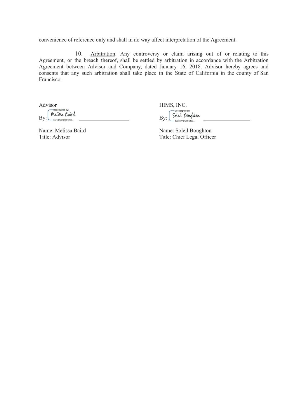convenience of reference only and shall in no way affect interpretation of the Agreement. 10. Arbitration. Any controversy or claim arising out of or relating to this Agreement, or the breach thereof, shall be settled by arbitration in accordance with the Arbitration Agreement between Advisor and Company, dated January 16, 2018. Advisor hereby agrees and consents that any such arbitration shall take place in the State of California in the county of San Francisco. Advisor By: Name: Melissa Baird Title: Advisor HIMS, INC. By: Name: Soleil Boughton Title: Chief Legal Officer