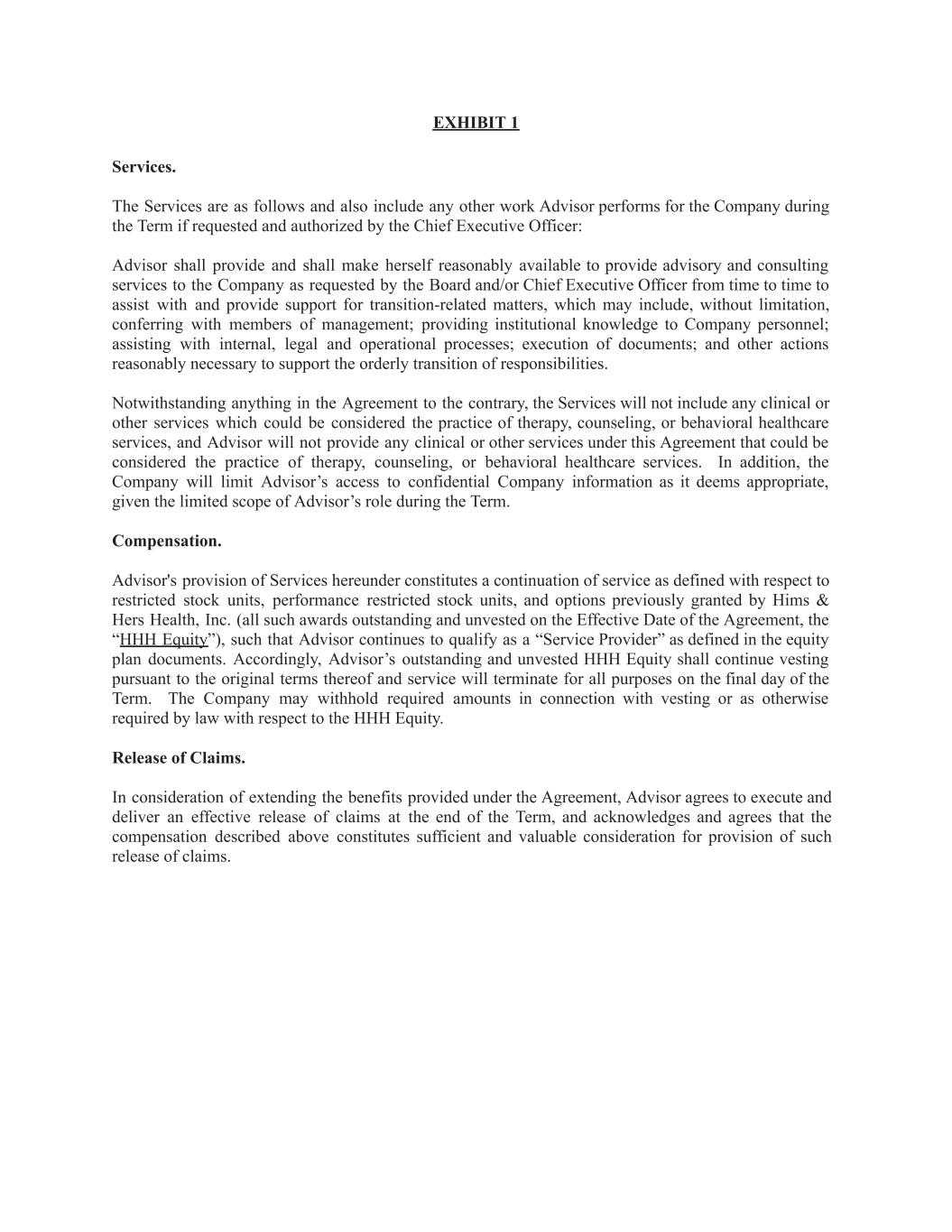 EXHIBIT 1 Services. The Services are as follows and also include any other work Advisor performs for the Company during the Term if requested and authorized by the Chief Executive Officer: Advisor shall provide and shall make herself reasonably available to provide advisory and consulting services to the Company as requested by the Board and/or Chief Executive Officer from time to time to assist with and provide support for transition-related matters, which may include, without limitation, conferring with members of management; providing institutional knowledge to Company personnel; assisting with internal, legal and operational processes; execution of documents; and other actions reasonably necessary to support the orderly transition of responsibilities. Notwithstanding anything in the Agreement to the contrary, the Services will not include any clinical or other services which could be considered the practice of therapy, counseling, or behavioral healthcare services, and Advisor will not provide any clinical or other services under this Agreement that could be considered the practice of therapy, counseling, or behavioral healthcare services. In addition, the Company will limit Advisor’s access to confidential Company information as it deems appropriate, given the limited scope of Advisor’s role during the Term. Compensation. Advisor's provision of Services hereunder constitutes a continuation of service as defined with respect to restricted stock units, performance restricted stock units, and options previously granted by Hims & Hers Health, Inc. (all such awards outstanding and unvested on the Effective Date of the Agreement, the “HHH Equity”), such that Advisor continues to qualify as a “Service Provider” as defined in the equity plan documents. Accordingly, Advisor’s outstanding and unvested HHH Equity shall continue vesting pursuant to the original terms thereof and service will terminate for all purposes on the final day of the Term. The Company may withhold required amounts in connection with vesting or as otherwise required by law with respect to the HHH Equity. Release of Claims. In consideration of extending the benefits provided under the Agreement, Advisor agrees to execute and deliver an effective release of claims at the end of the Term, and acknowledges and agrees that the compensation described above constitutes sufficient and valuable consideration for provision of such release of claims.