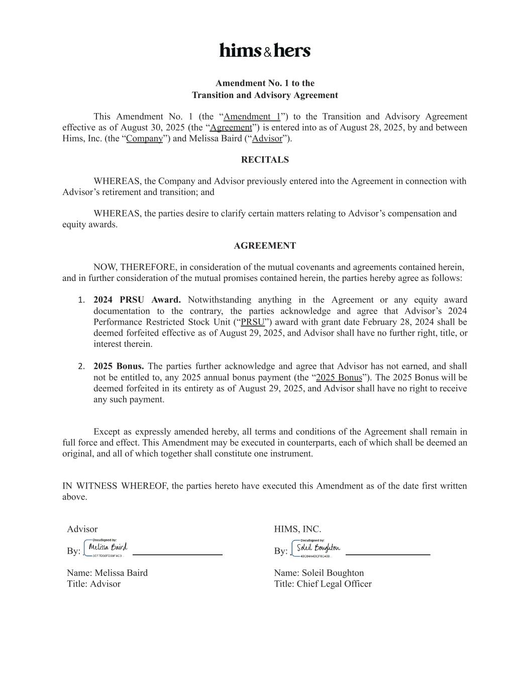 Amendment No. 1 to the Transition and Advisory Agreement This Amendment No. 1 (the “Amendment 1”) to the Transition and Advisory Agreement effective as of August 30, 2025 (the “Agreement”) is entered into as of August 28, 2025, by and between Hims, Inc. (the “Company”) and Melissa Baird (“Advisor”). RECITALS WHEREAS, the Company and Advisor previously entered into the Agreement in connection with Advisor’s retirement and transition; and WHEREAS, the parties desire to clarify certain matters relating to Advisor’s compensation and equity awards. AGREEMENT NOW, THEREFORE, in consideration of the mutual covenants and agreements contained herein, and in further consideration of the mutual promises contained herein, the parties hereby agree as follows: 1. 2024 PRSU Award. Notwithstanding anything in the Agreement or any equity award documentation to the contrary, the parties acknowledge and agree that Advisor’s 2024 Performance Restricted Stock Unit (“PRSU”) award with grant date February 28, 2024 shall be deemed forfeited effective as of August 29, 2025, and Advisor shall have no further right, title, or interest therein. 2. 2025 Bonus. The parties further acknowledge and agree that Advisor has not earned, and shall not be entitled to, any 2025 annual bonus payment (the “2025 Bonus”). The 2025 Bonus will be deemed forfeited in its entirety as of August 29, 2025, and Advisor shall have no right to receive any such payment. Except as expressly amended hereby, all terms and conditions of the Agreement shall remain in full force and effect. This Amendment may be executed in counterparts, each of which shall be deemed an original, and all of which together shall constitute one instrument. IN WITNESS WHEREOF, the parties hereto have executed this Amendment as of the date first written above. Advisor By: Name: Melissa Baird Title: Advisor HIMS, INC. By: Name: Soleil Boughton Title: Chief Legal Officer