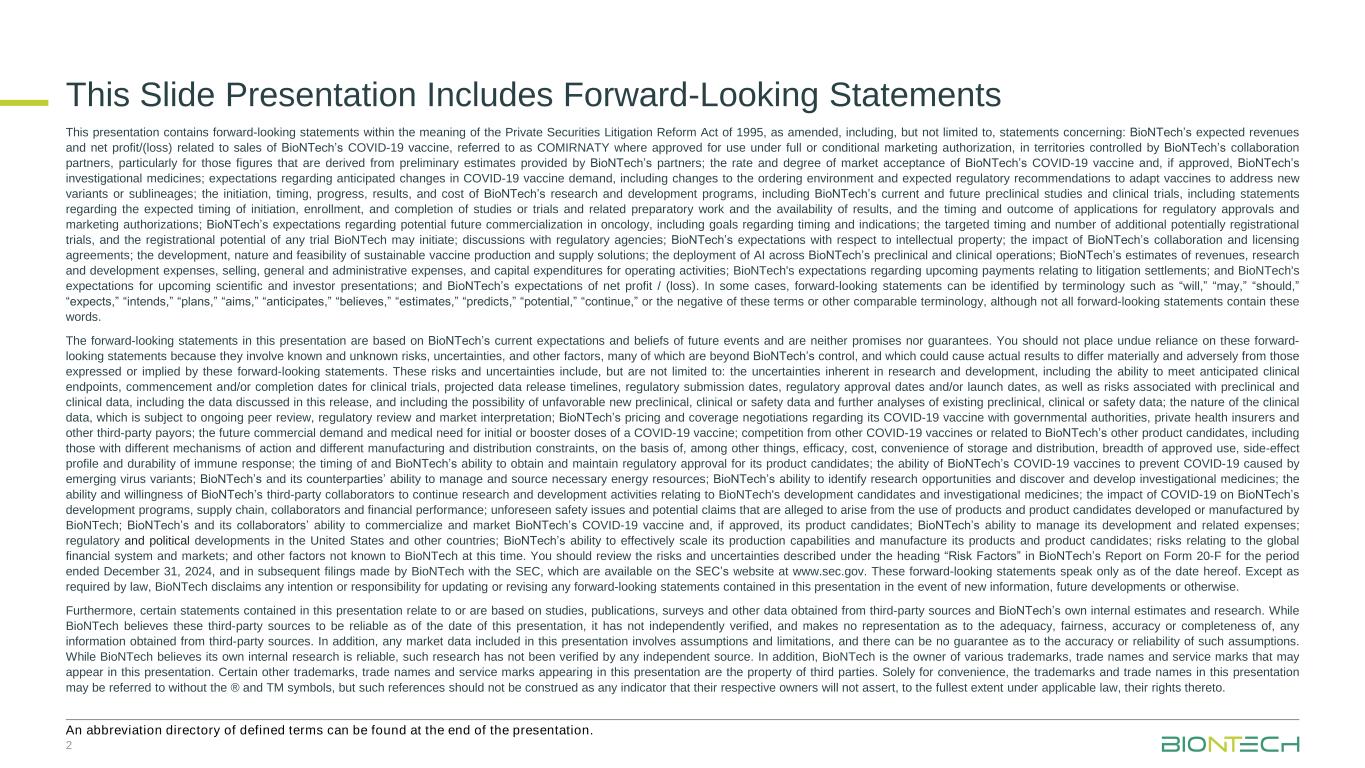 •In December 2024, the U.S. Food and Drug Administration (“FDA”) lifted the partial clinical hold on the OncoC4-sponsored Phase 3 clinical trial (PRESERVE-003; NCT05671510) evaluating the efficacy and safety of BNT316/ONC-392 as monotherapy in patients with metastatic NSCLC that progressed under previous PD-(L)1-inhibitor treatment. Based on the available clinical trial data and upon alignment with the FDA, the companies will solely continue enrollment of patients with squamous NSCLC.