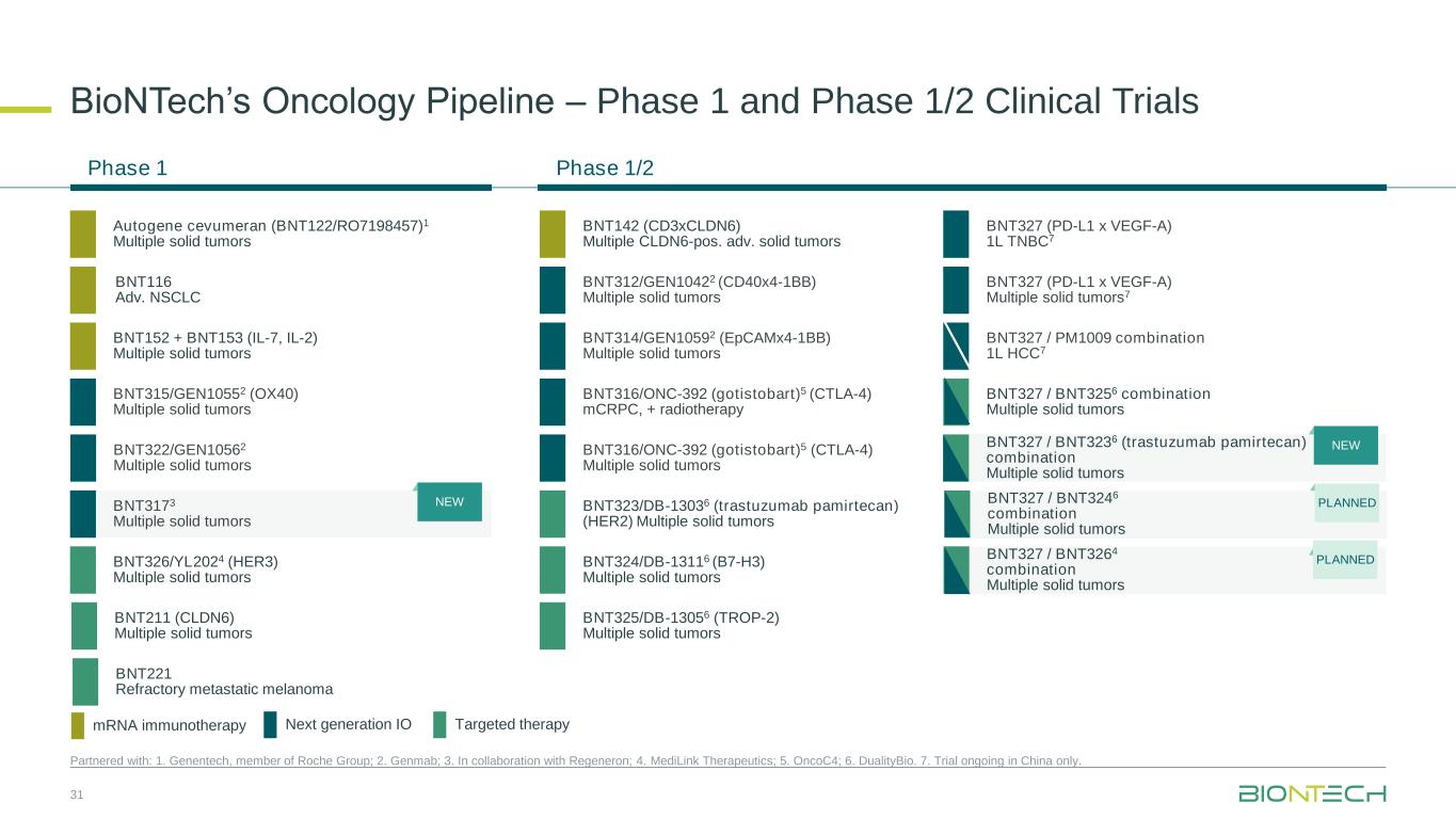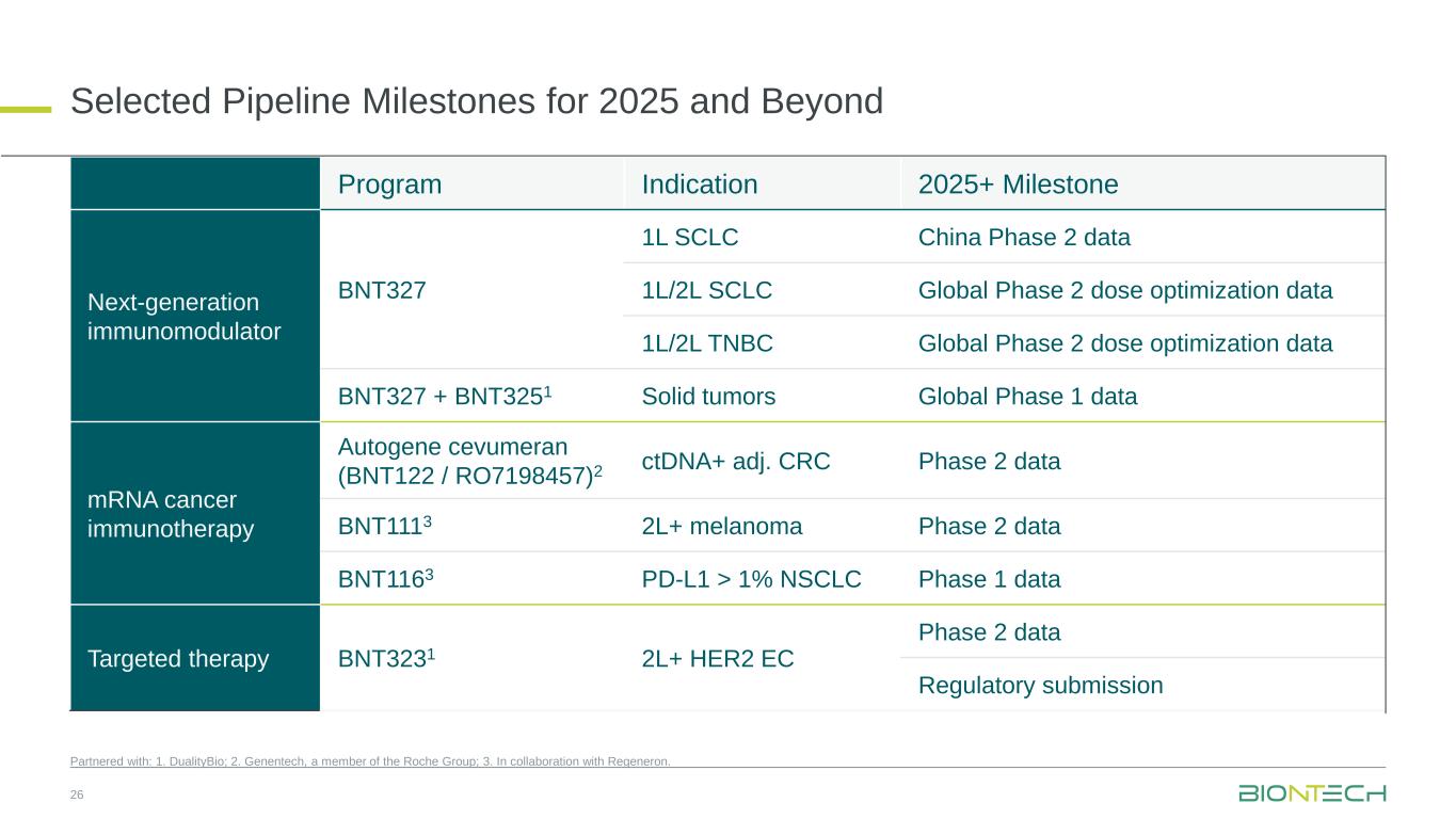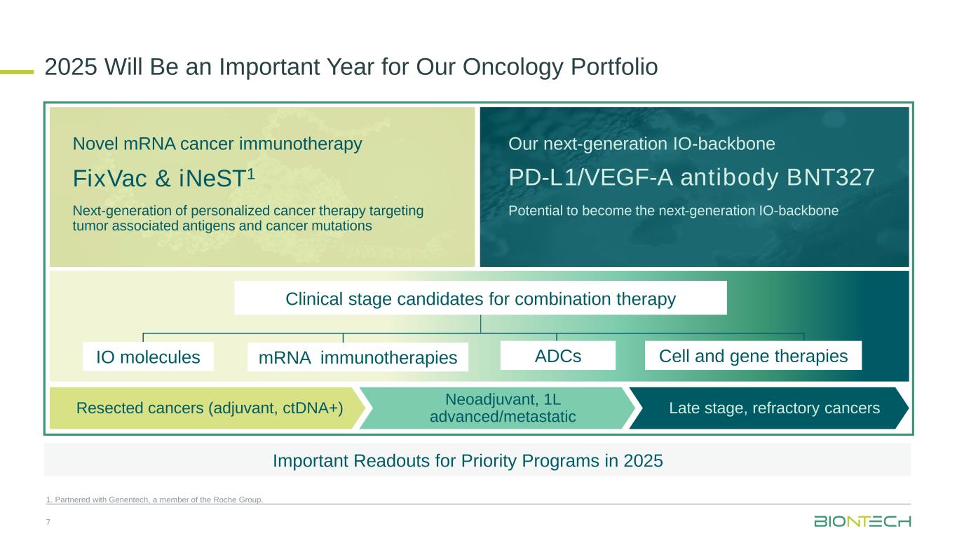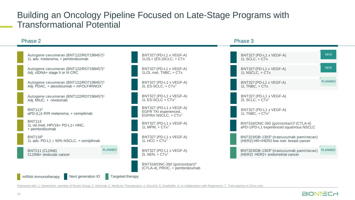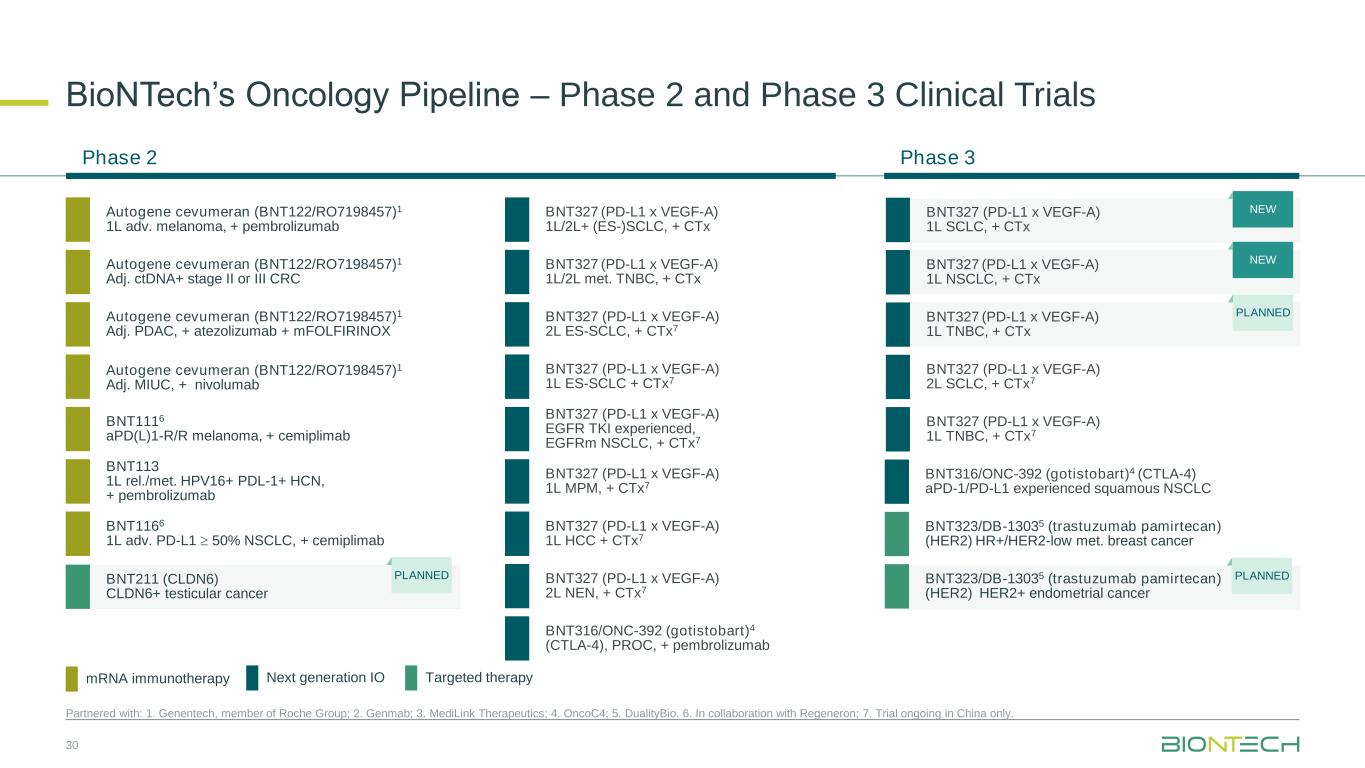Advanced oncology pipeline including more than 20 active Phase 2 and Phase 3 clinical trials with a strategic focus on two priority pan-tumor programs: next-generation immunomodulator candidate BNT327 and mRNA cancer immunotherapies