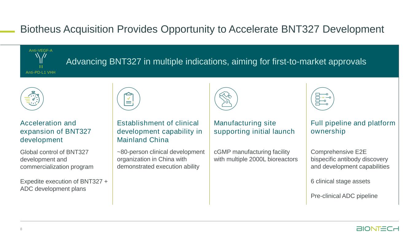 •Completed acquisition of Biotheus securing full control of next-generation immunomodulator candidate BNT327, a bispecific antibody targeting PD-L1 and VEGF-A*