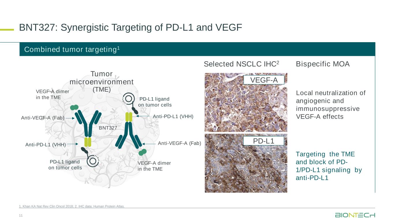 BNT327 is a bispecific antibody candidate combining PD-L1 checkpoint inhibition with VEGF-A neutralization.