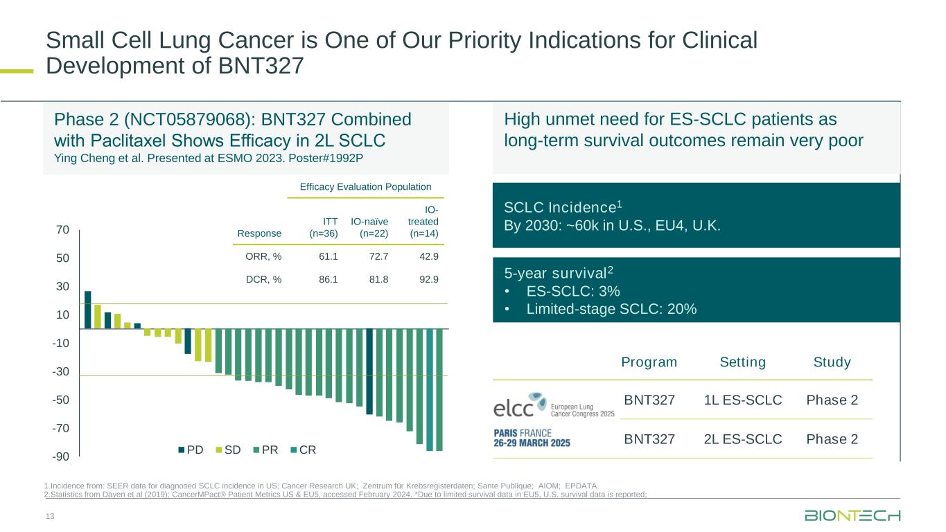 •In December 2024, BioNTech initiated a global randomized Phase 3 clinical trial (NCT06712355) evaluating BNT327 plus chemotherapy compared to atezolizumab plus chemotherapy in first-line extensive-stage small cell lung cancer (“ES-SCLC”).