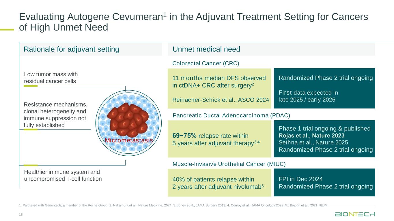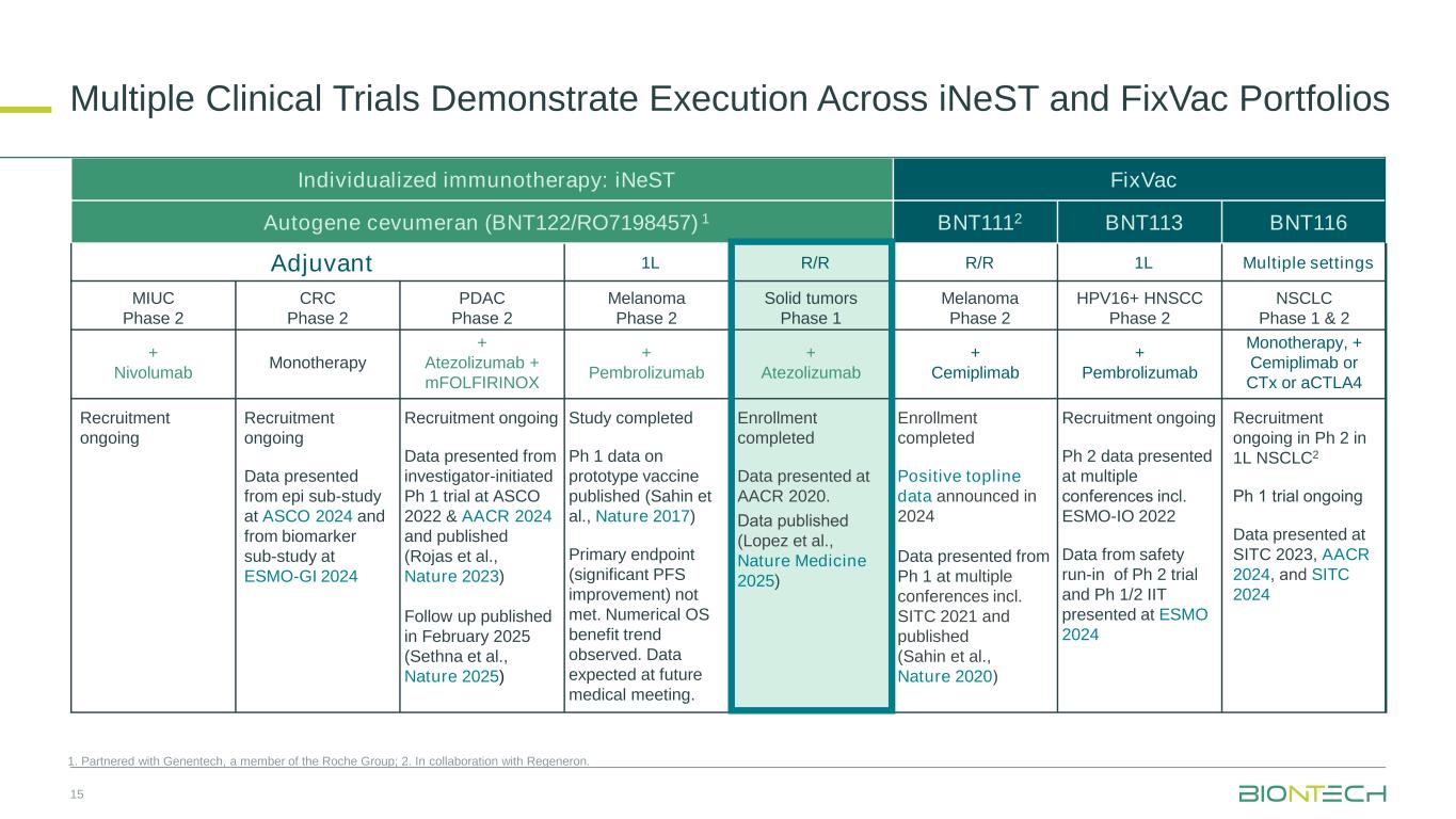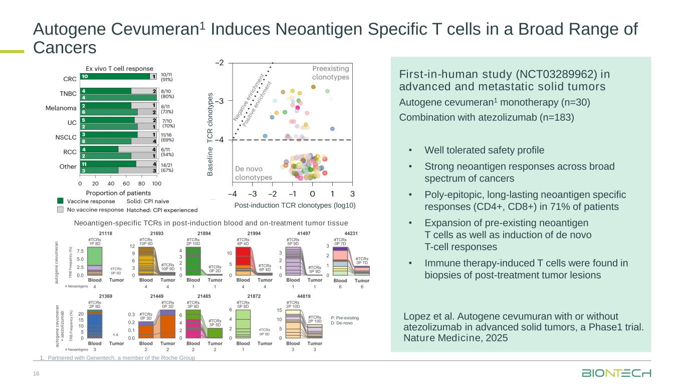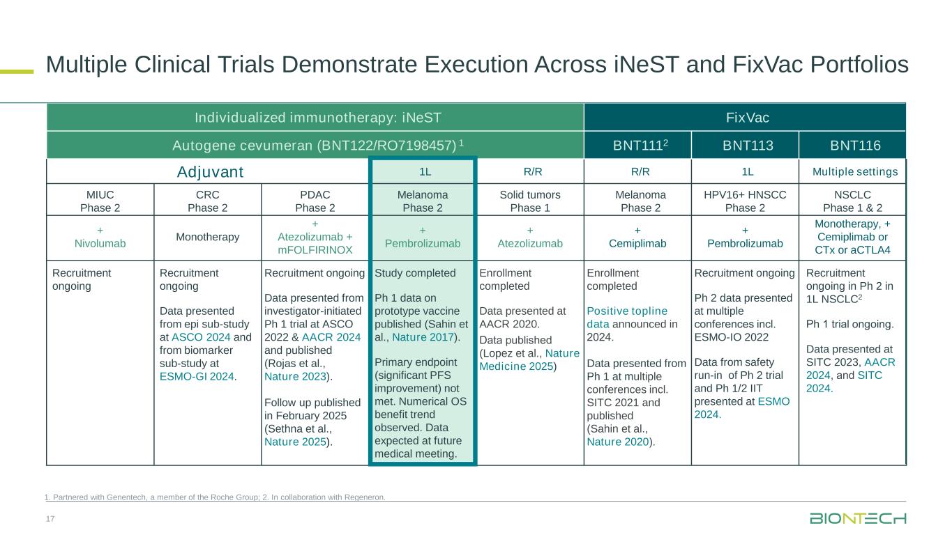 •In January 2025, a manuscript summarizing the results of a Phase 1 clinical trial (NCT03289962) evaluating autogene cevumeran in combination with atezolizumab in patients with advanced solid tumors was published in Nature Medicine (Lopez et al., 2025). In February 2025, a manuscript denoting follow up data from an investigator-initiated Phase 1 clinical trial (NCT04161755, Rojas et al., 2023) evaluating autogene cevumeran in combination with atezolizumab in patients with pancreatic ductal adenocarcinoma (“PDAC”) in an adjuvant treatment setting was published in Nature (Sethna et al., 2025).