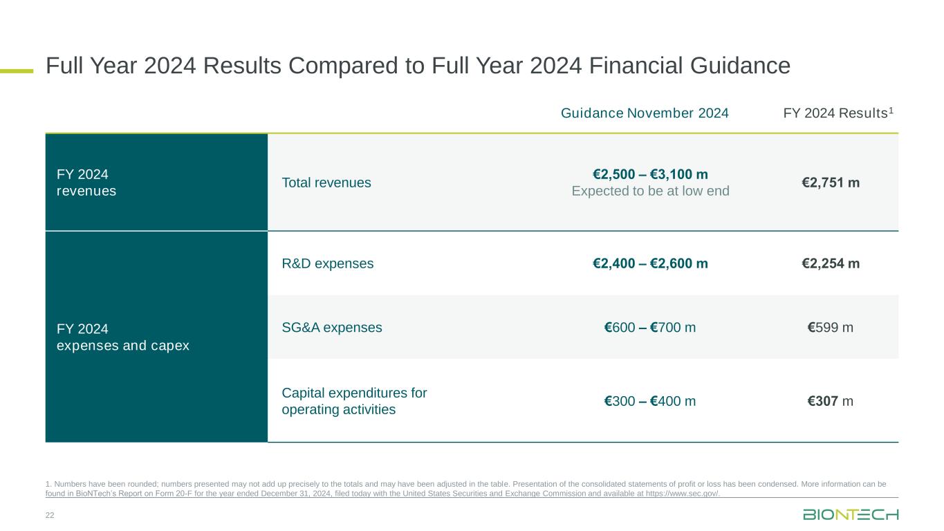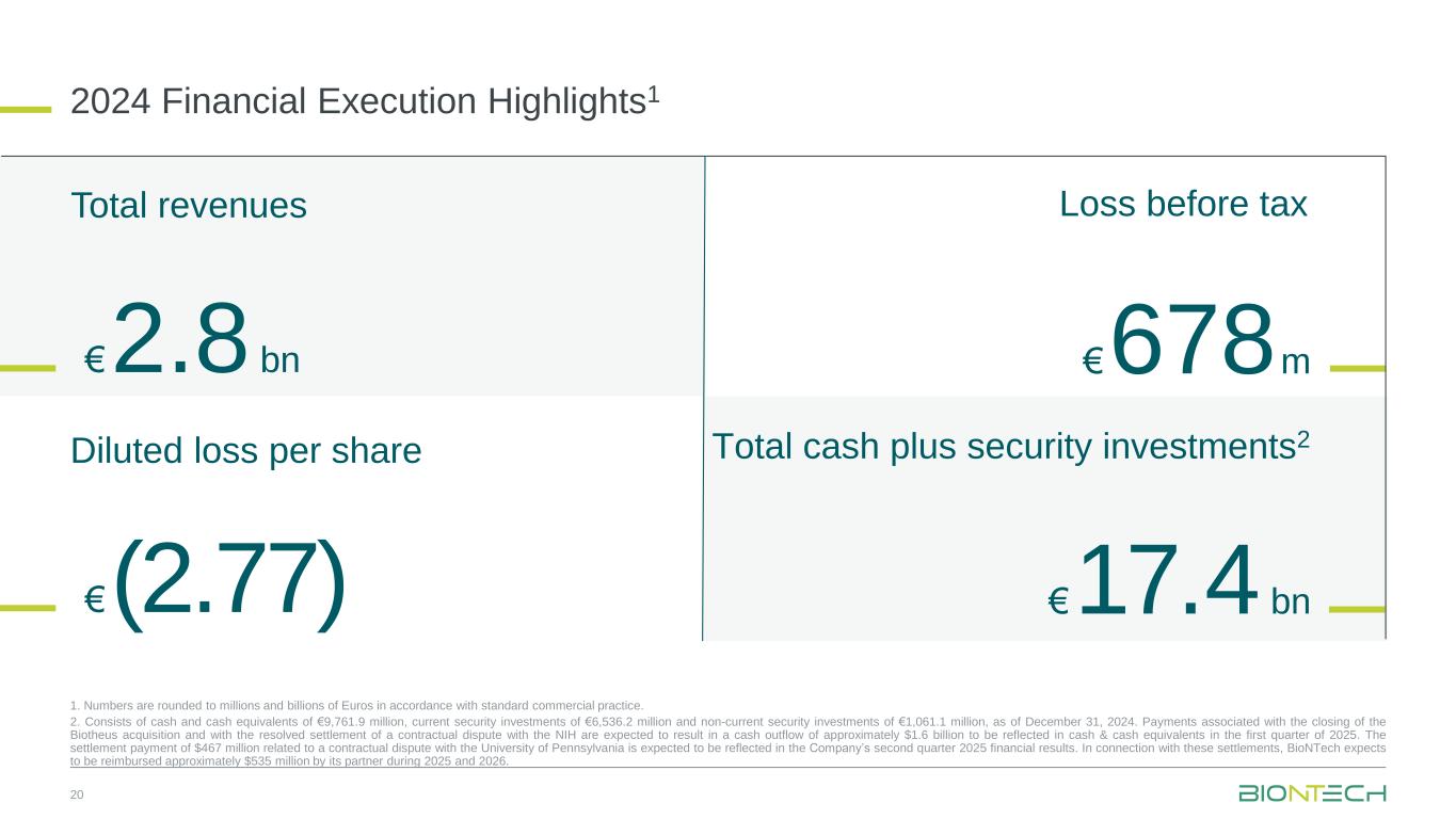 2 Payments associated with the closing of the Biotheus acquisition and with the resolved settlement of a contractual dispute with the National Institutes of Health (“NIH”) are expected to result in a cash outflow of approximately $1.6 billion to be reflected in cash & cash equivalents in the Company’s first quarter 2025 financial results. The settlement payment of $467 million related to a contractual dispute with the University of Pennsylvania is expected to be reflected in the Company’s second quarter 2025 financial results. In connection with these settlements, BioNTech expects to be reimbursed approximately $535 million by its partner during 2025 and 2026.