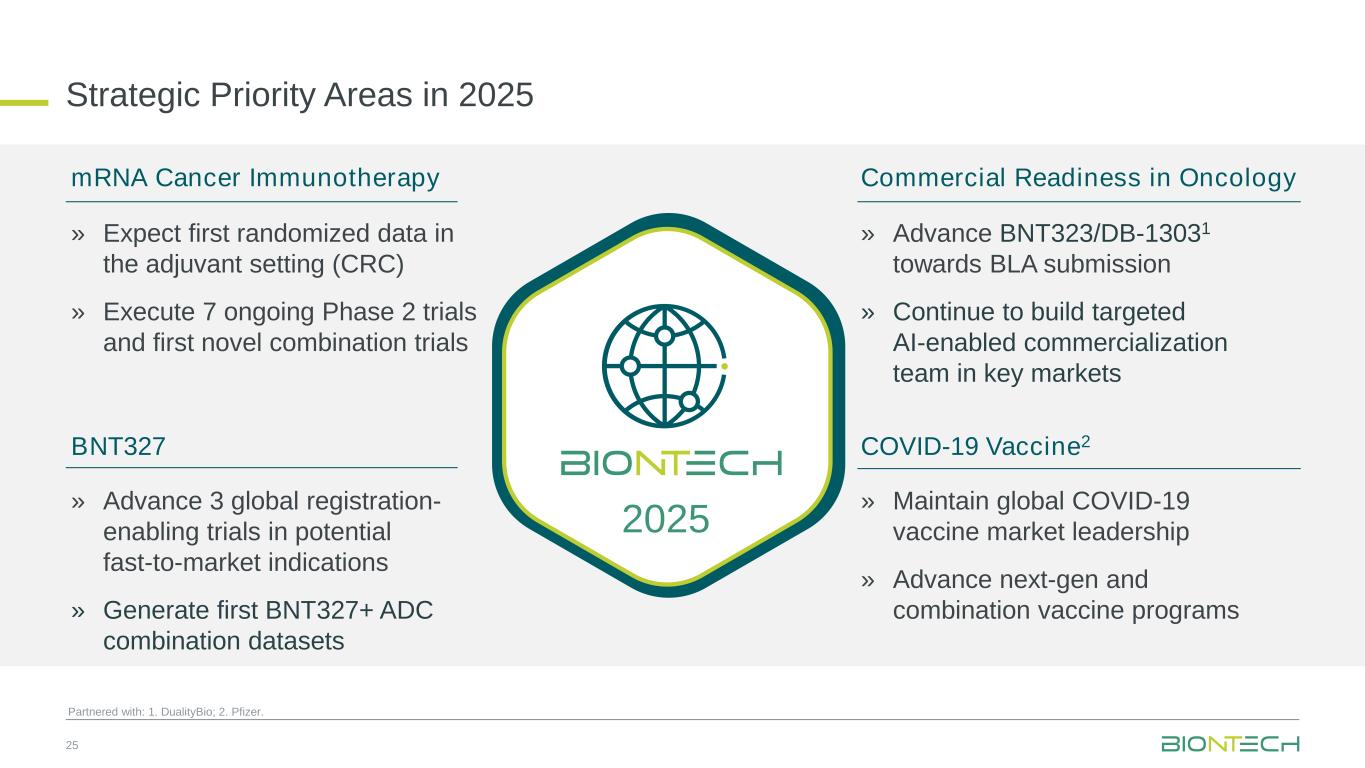 In 2024, the Company’s pipeline continued to mature towards later stages of clinical development with a focus on two priority programs: our investigational next-generation immunomodulator candidate BNT327 and mRNA cancer immunotherapies. BioNTech’s oncology pipeline currently contains over 20 ongoing Phase 2 and 3 clinical trials. In 2025, the Company plans to continue progressing its pipeline towards commercialization, with its first oncology launch expected in 2026.