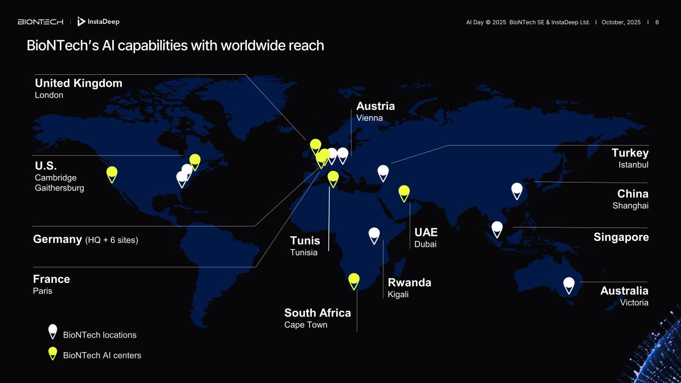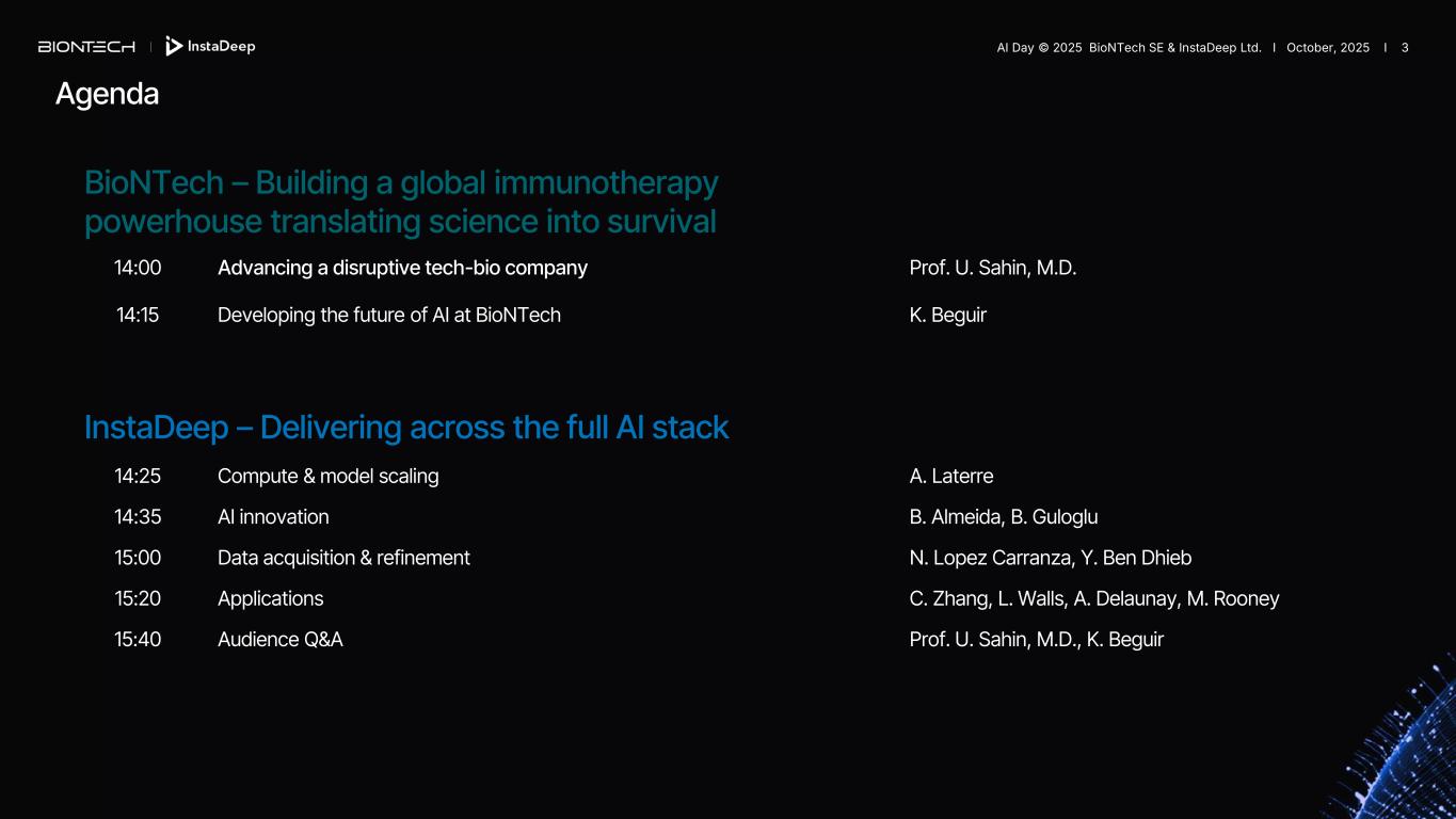 This slide presentation includes forward-looking statements This presentation contains forward-looking statements within the meaning of the Private Securities Litigation Reform Act of 1995, as amended. In some cases, forward-looking statements can be identified by terminology such as “will,” “may,” “should,” “expects,” “intends,” “plans,” “aims,” “anticipates,” “believes,” “estimates,” “predicts,” “potential,” “continue,” or the negative of these terms or other comparable terminology, although not all forward-looking statements contain these words. The forward-looking statements in this presentation are neither promises nor guarantees, and you should not place undue reliance on these forward-looking statements because they involve known and unknown risks, uncertainties, and other factors, many of which are beyond BioNTech’s control; and which could cause actual results to differ materially from those expressed or implied by these forward-looking statements. You should review the risks and uncertainties described under the heading “Risk Factors” in BioNTech's Quarterly Report on Form 6-K for the period ended June 30, 2025; and in subsequent filings made by BioNTech with the SEC, which are available on the SEC’s website at https://www.sec.gov/. Except as required by law, BioNTech disclaims any intention or responsibility for updating or revising any forward-looking statements contained in this presentation in the event of new information, future developments or otherwise. These forward-looking statements are based on BioNTech’s current expectations and speak only as of the date hereof. Furthermore, certain statements contained in this presentation relate to or are based on studies, publications, surveys and other data obtained from third-party sources and BioNTech’s own internal estimates and research. While BioNTech believes these third-party sources to be reliable as of the date of this presentation, it has not independently verified, and makes no representation as to the adequacy, fairness, accuracy or completeness of, any information obtained from third-party sources. In addition, any market data included in this presentation involves assumptions and limitations, and there can be no guarantee as to the accuracy or reliability of such assumptions. While BioNTech believes its own internal research is reliable, such research has not been verified by any independent source. This presentation contains references to our trademarks and to trademarks belong to other entities. Solely for convenience, trademarks and trade names referred to, including logos, artwork and other visual displays, may appear without the ® or TM symbols, but such references are not intended to indicate, in any way, that their respective owners will not assert, to the fullest extent under applicable law, their rights thereto. We do not intend our use or display of other companies’ trade names or trademarks to imply a relationship with, or endorsement or sponsorship of us by, any other companies. AI Day © 2025 BioNTech SE & InstaDeep Ltd. I October, 2025 I 2