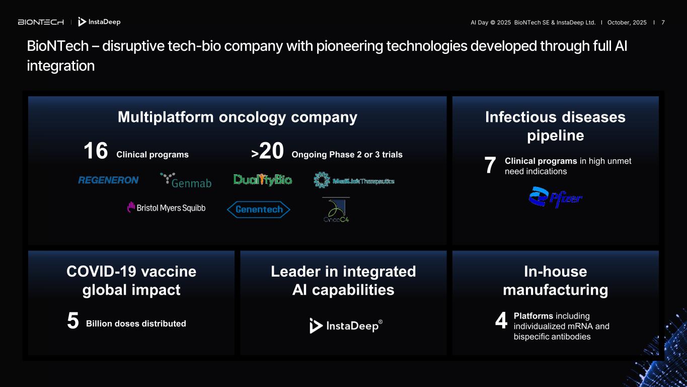 BioNTech’s AI capabilities with worldwide reach BioNTech locations BioNTech AI centers Rwanda Kigali Austria Vienna Germany (HQ + 6 sites) Singapore U.S. Cambridge Gaithersburg China Shanghai Turkey Istanbul Australia Victoria United Kingdom London South Africa Cape Town UAE DubaiTunis Tunisia France Paris AI Day © 2025 BioNTech SE & InstaDeep Ltd. I October, 2025 I 6