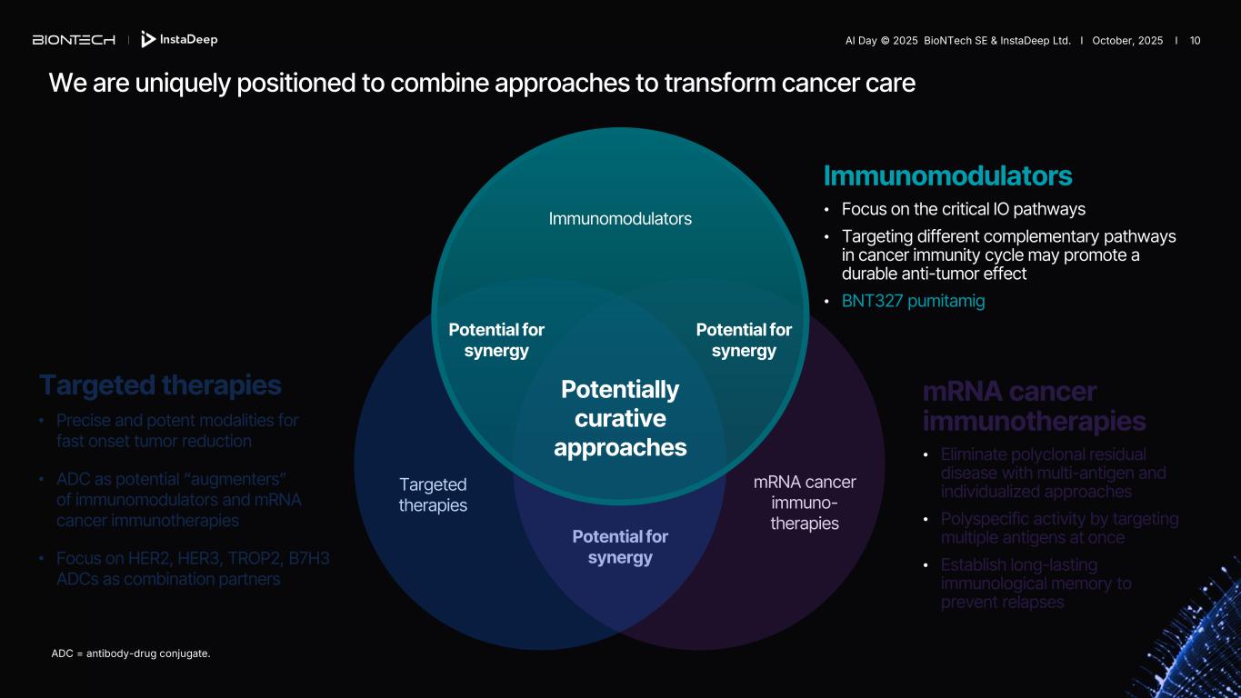 We are uniquely positioned to combine approaches to transform cancer care ADC = antibody-drug conjugate. Immunomodulators • Focus on the critical IO pathways • Targeting different complementary pathways in cancer immunity cycle may promote a durable anti-tumor effect mRNA cancer immunotherapies • Eliminate polyclonal residual disease with multi-antigen and individualized approaches • Polyspecific activity by targeting multiple antigens at once • Establish long-lasting immunological memory to prevent relapses Targeted therapies • Precise and potent modalities for fast onset tumor reduction • ADC as potential “augmenters” of immunomodulators and mRNA cancer immunotherapies • Focus on HER2, HER3, TROP2, B7H3 ADCs as combination partners mRNA cancer immuno- therapies Targeted therapies Immunomodulators Potentially curative approaches Potential for synergy Potential for synergy Potential for synergy AI Day © 2025 BioNTech SE & InstaDeep Ltd. I October, 2025 I 9