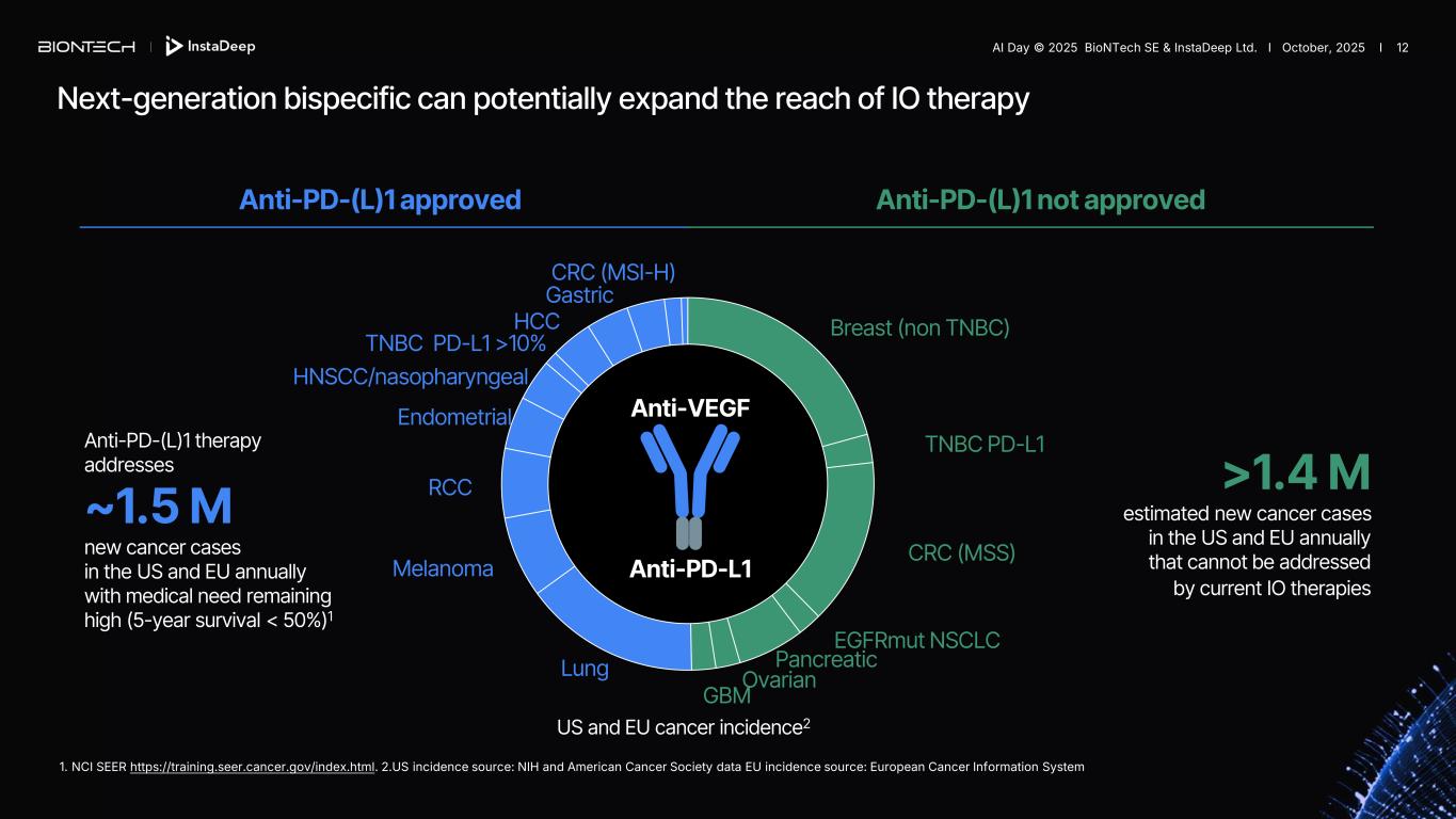 Local neutralization of angiogenic and immunosuppressive VEGF-A effects VEGF-A PD-L1 Targeting the TME and blockade of PD-1/PD-L1 signaling Anti-VEGF-A (Fab) Anti-PD-L1 (VHH) VEGF-A dimer in the TME PD-L1 ligand on tumor cells Pumitamig VEGF-A dimer in the TME Anti-VEGF-A (Fab) Anti-PD-L1 (VHH) PD-L1 ligand on tumor cells NSCLC IHC2 1. Partnered with Bristol Myers Squibb; 2. IHC data: Human Protein Atlas Pumitamig’s synergistic targeting of PD-L1 and VEGF1 Tumor microenvironment (TME) AI Day © 2025 BioNTech SE & InstaDeep Ltd. I October, 2025 I 11