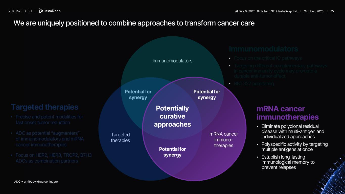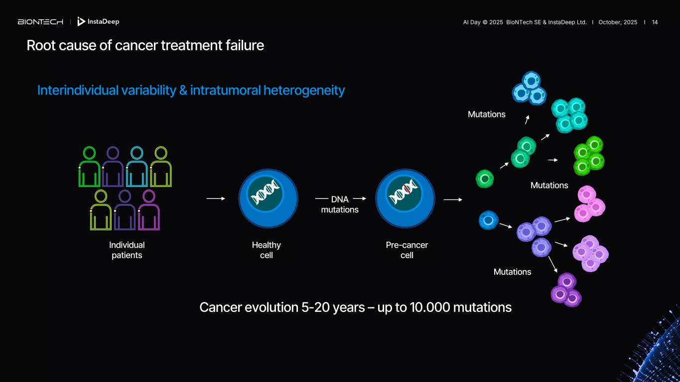 Interindividual variability & intratumoral heterogeneity Cancer evolution 5-20 years – up to 10.000 mutations Healthy cell Pre-cancer cell Mutations Mutations Mutations Individual patients DNA mutations Root cause of cancer treatment failure AI Day © 2025 BioNTech SE & InstaDeep Ltd. I October, 2025 I 14