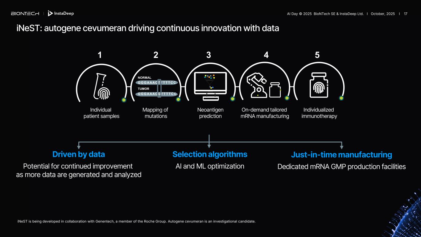 1 6 Individual patient samples (blood and tissue) Artificial intelligence- driven neoantigen prediction On-demand tailored RNA manufacturing Individualized immuno- therapy Mapping of mutations Fixed combination of shared tumor antigens2 Multi-antigen approach tailored to each indication Neoantigens Individualized therapy Multiple shared antigens Off-the-shelf therapy iNeST1 FixVac individualized Neoantigen- Specific immunotherapy Fixed Antigen Vaccine ANTIGEN 1 ANTIGEN 2 ANTIGEN 3 ANTIGEN 4 mRNA- lipoplex platform Described in Castle et al., Cancer Res 2011, Kreiter et al., Nature 2025 Described in Sahin et al., Nature 2017, Rojas et al. Nature 2023 Leveraging our leadership in mRNA to fully exploit cancer immunotherapy target space with two approaches 1. Partnered with Genentech, a member of the Roche Group. 2 Antigens vary across programs; 3. T-cell responses analyzed by ex vivo multimer staining analysis in blood. Described in Kranz et al., Nature 2016 and In Sahin et. al., Nature 2020 AI Day © 2025 BioNTech SE & InstaDeep Ltd. I October, 2025 I 16