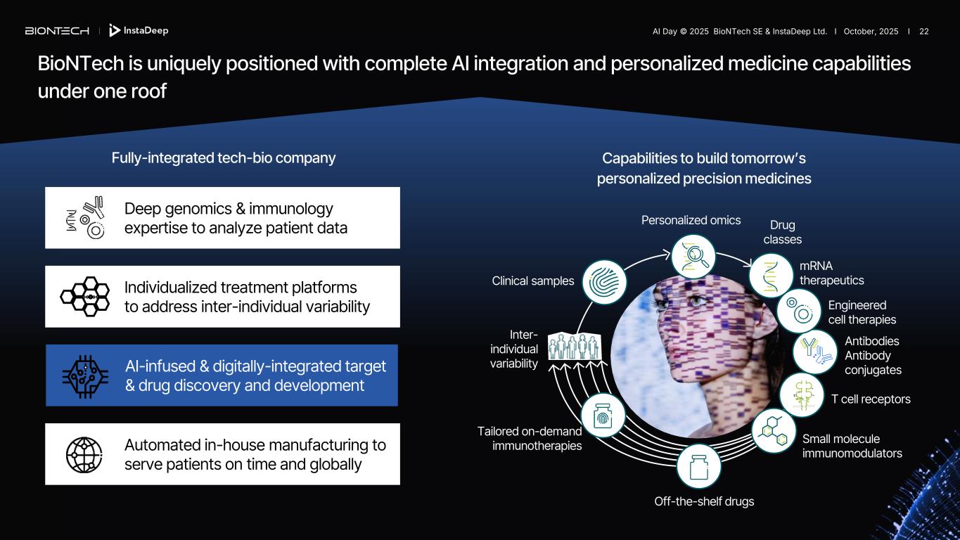 Personalized immunotherapy AI-powered bio-engineering • iNeST1: Personalized immunotherapy platform levering AI to create therapies unique to each patient’s tumor • 4 ongoing trials • >450 patients treated2 • 18,000 neoantigens selected2 • Computational extension of immunotherapy target space3 • Semi-automated manufacturing capabilities for iNeST1 • Development of novel DeepChain platform combining cutting-edge AI and bio-engineering • Optimization of mRNA design & structure • Automated dry-wet lab to enhance discovery capabilities • In-house supercomputing cluster with ~500 PetaFLOPS of Nvidia H100 GPUs Our leading scientific capabilities are fueled by AI to pioneer personalized immunotherapies 1. Partnered with Genentech, a member of the Roche Group; 2. From trials BNT122-01, GO39733, GO40558 and ML41081; 3. Castle et al. 2011 Cancer Res. A I AI Day © 2025 BioNTech SE & InstaDeep Ltd. I October, 2025 I 21