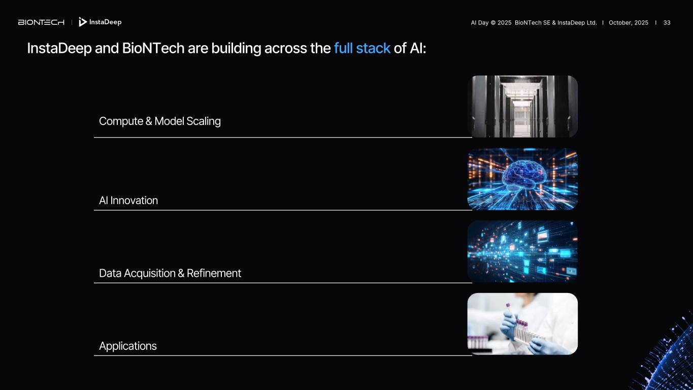 Compute & Model Scaling Applications Data Acquisition & Refinement AI Innovation InstaDeep and BioNTech are building across the full stack of AI: AI Day © 2025 BioNTech SE & InstaDeep Ltd. I October, 2025 I 33