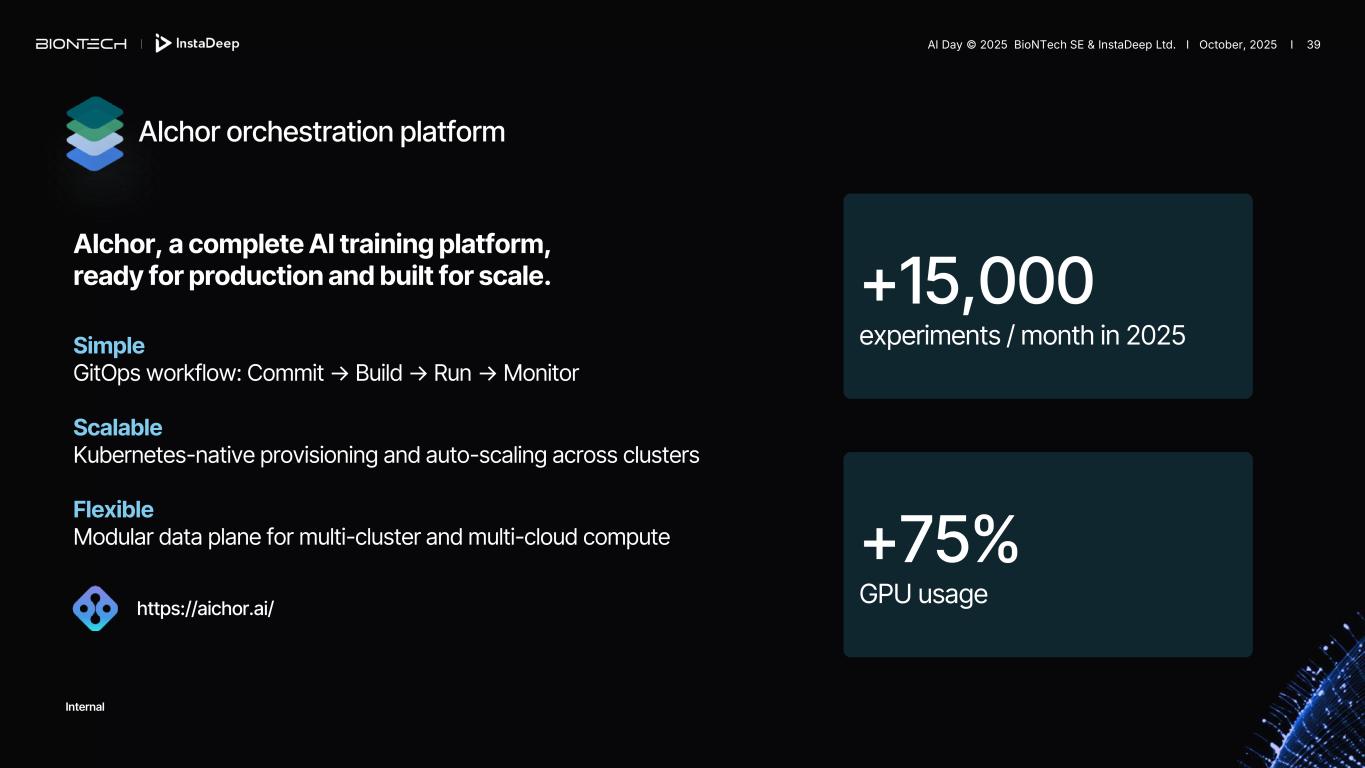 ~500 PetaFLOPS of Nvidia H100 GPUs 86,000 CPU Cores 1.2 Tons of Hardware per Rack ▪ Custom rack design engineered in-house ▪ Optimised for AI performance and cost efficiency ▪ Powered 100% by renewable energy ▪ Designed to scale seamlessly with next-generation hardware ▪ Tight hardware–software integration for control and efficiency Kyber, InstaDeep's AI supercomputer Internal AI Day © 2025 BioNTech SE & InstaDeep Ltd. I October, 2025 I 38