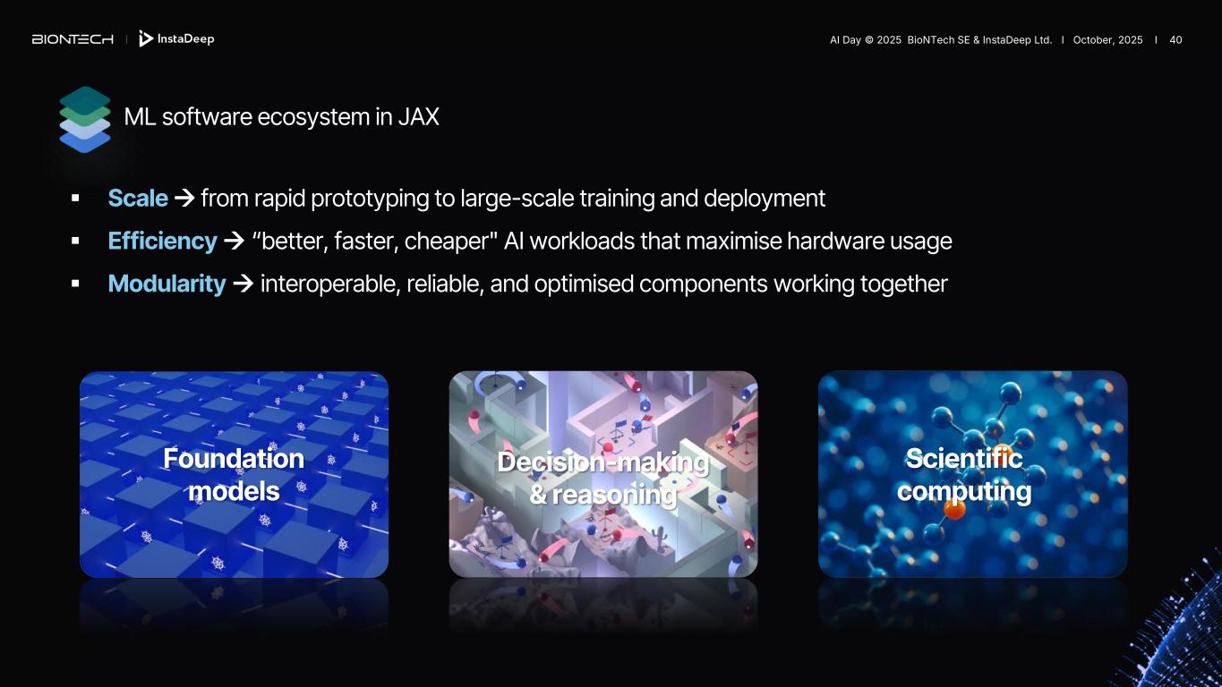 ▪ Scale→ from rapid prototyping to large-scale training and deployment ▪ Efficiency→ “better, faster, cheaper" AI workloads that maximise hardware usage ▪ Modularity → interoperable, reliable, and optimised components working together ML software ecosystem in JAX Foundation models Decision-making & reasoning Scientific computing AI Day © 2025 BioNTech SE & InstaDeep Ltd. I October, 2025 I 40