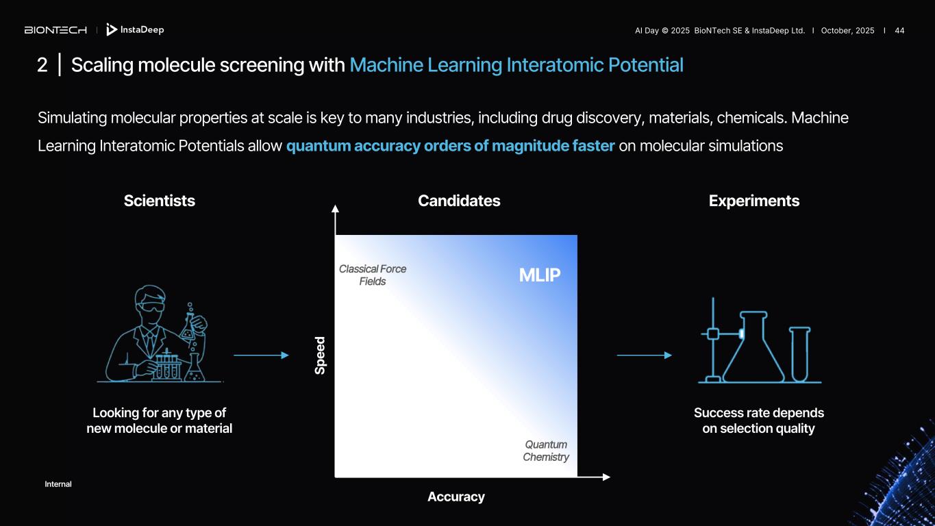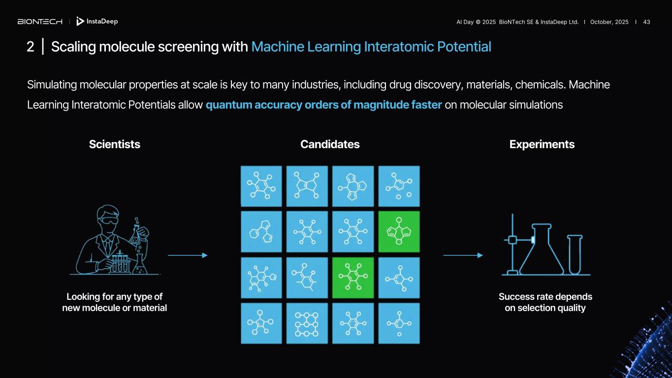 Simulating molecular properties at scale is key to many industries, including drug discovery, materials, chemicals. Machine Learning Interatomic Potentials allow quantum accuracy orders of magnitude faster on molecular simulations 2 | Scaling molecule screening with Machine Learning Interatomic Potential Scientists Candidates Experiments Looking for any type of new molecule or material Success rate depends on selection quality AI Day © 2025 BioNTech SE & InstaDeep Ltd. I October, 2025 I 43