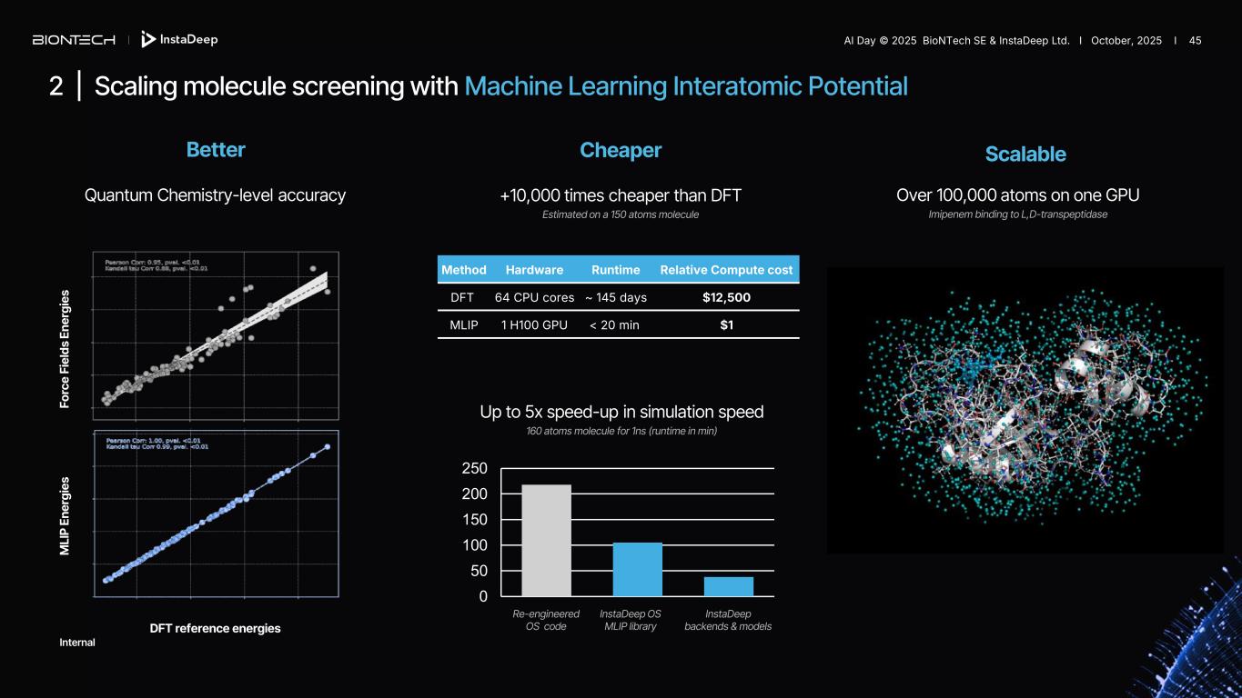 Up to 5x speed-up in simulation speed 160 atoms molecule for 1ns (runtime in min) Re-engineered OS code InstaDeep OS MLIP library InstaDeep backends & models Over 100,000 atoms on one GPU Imipenem binding to L,D-transpeptidase Better Cheaper Scalable Quantum Chemistry-level accuracy 2 | Scaling molecule screening with Machine Learning Interatomic Potential M LI P E ne rg ie s Fo rc e Fi el d s En er g ie s DFT reference energies Method Hardware Runtime Relative Compute cost DFT 64 CPU cores ~ 145 days $12,500 MLIP 1 H100 GPU < 20 min $1 0 50 100 150 200 250 +10,000 times cheaper than DFT Estimated on a 150 atoms molecule Internal AI Day © 2025 BioNTech SE & InstaDeep Ltd. I October, 2025 I 45