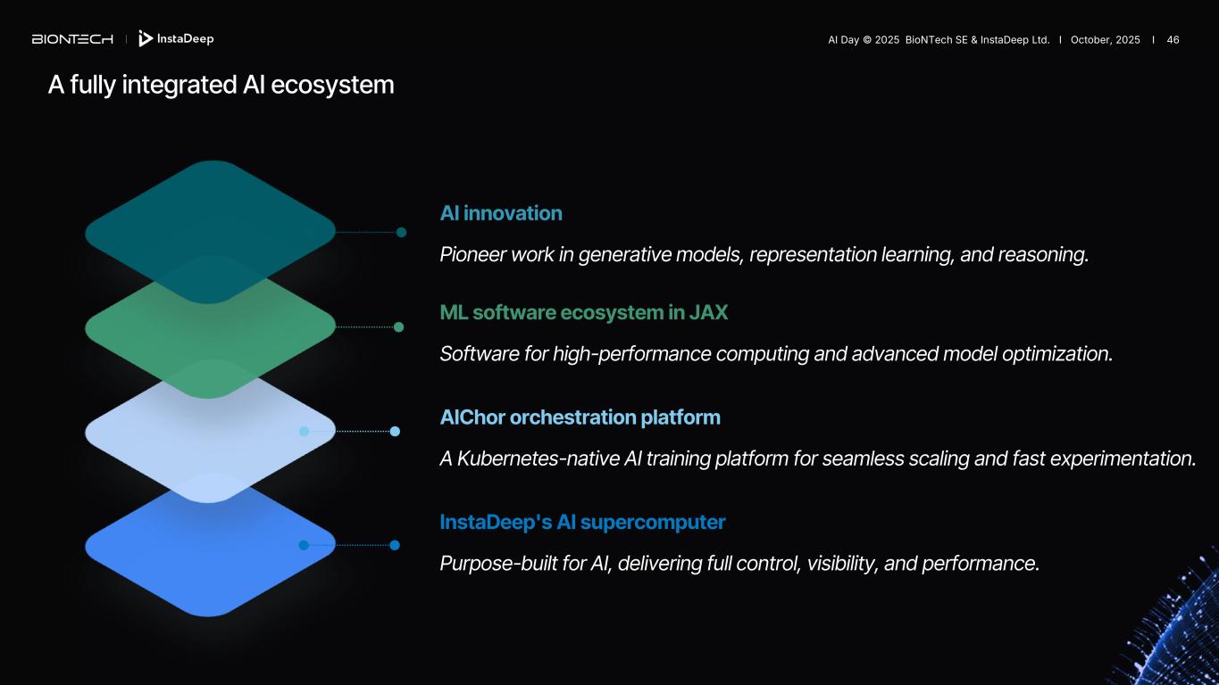A fully integrated AI ecosystem InstaDeep's AI supercomputer Purpose-built for AI, delivering full control, visibility, and performance. AIChor orchestration platform A Kubernetes-native AI training platform for seamless scaling and fast experimentation. ML software ecosystem in JAX Software for high-performance computing and advanced model optimization. AI innovation Pioneer work in generative models, representation learning, and reasoning. AI Day © 2025 BioNTech SE & InstaDeep Ltd. I October, 2025 I 46