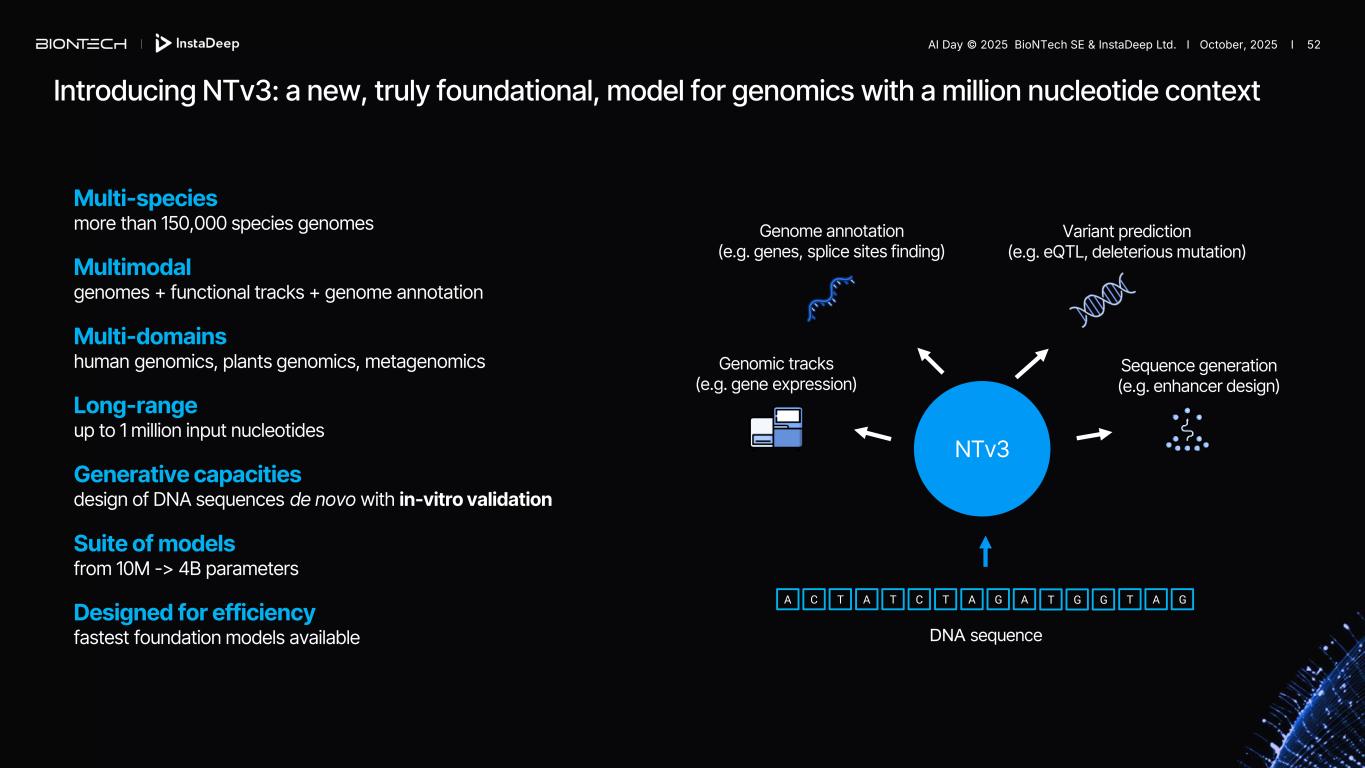 Exploiting the data available with the aim of building a best-in-class model for genomics Learn from genomes OR Learn from functional data Nucleotide Transformer v3 NTv3 NT Evo Borzoi AlphaGenome Pre-training on genomes from >150,000 species Post-training on >17,000 functional tracks across 16 species AI Day © 2025 BioNTech SE & InstaDeep Ltd. I October, 2025 I 51