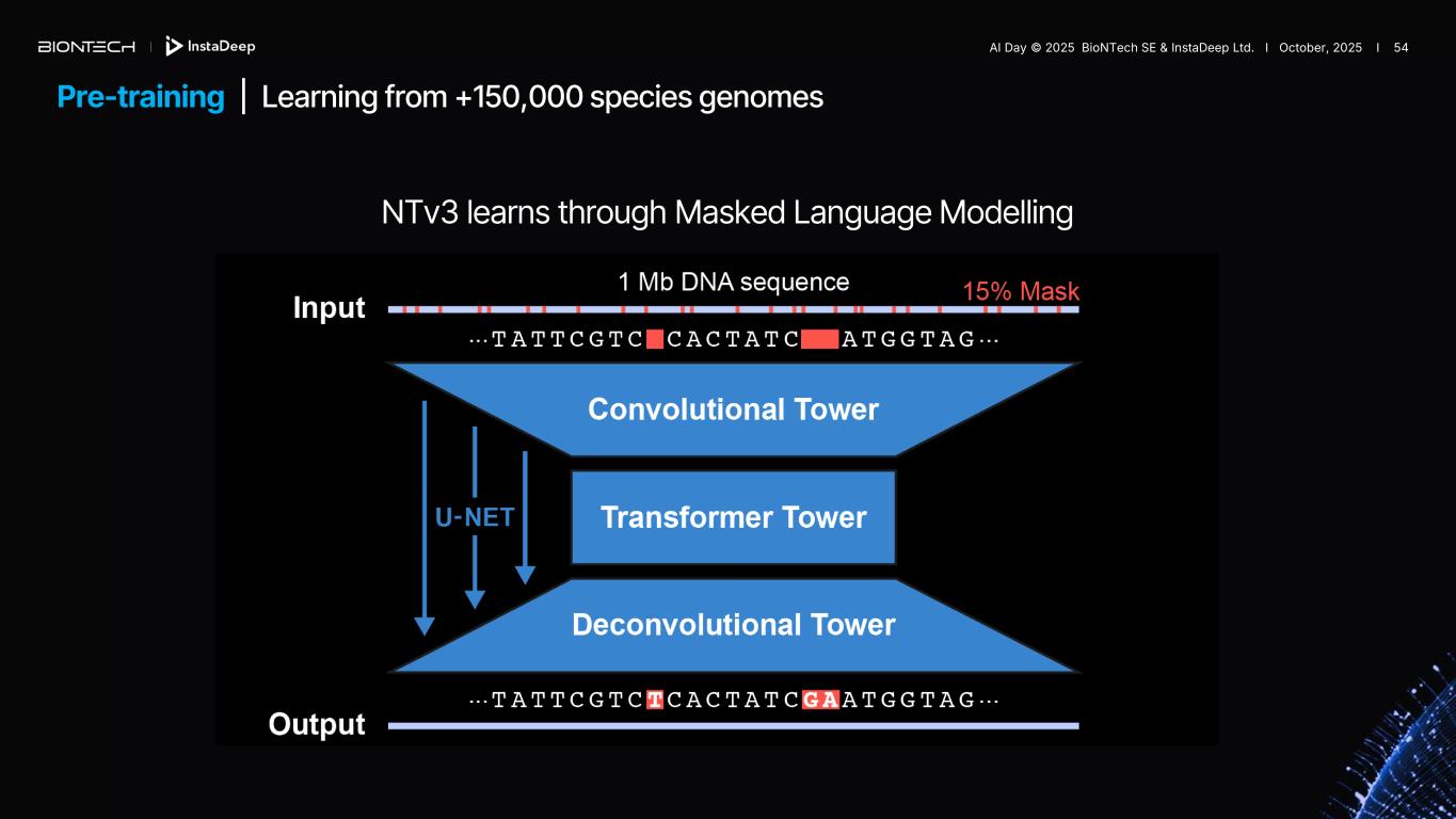 NTv3 learns through Masked Language Modelling Pre-training | Learning from +150,000 species genomes AI Day © 2025 BioNTech SE & InstaDeep Ltd. I October, 2025 I 54