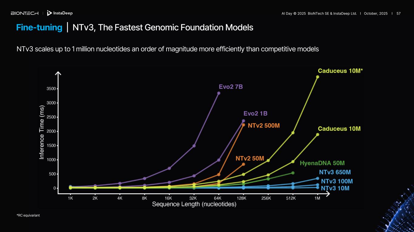 Fine-tuning | NTv3, The Fastest Genomic Foundation Models NTv3 scales up to 1 million nucleotides an order of magnitude more efficiently than competitive models *RC equivariant AI Day © 2025 BioNTech SE & InstaDeep Ltd. I October, 2025 I 56