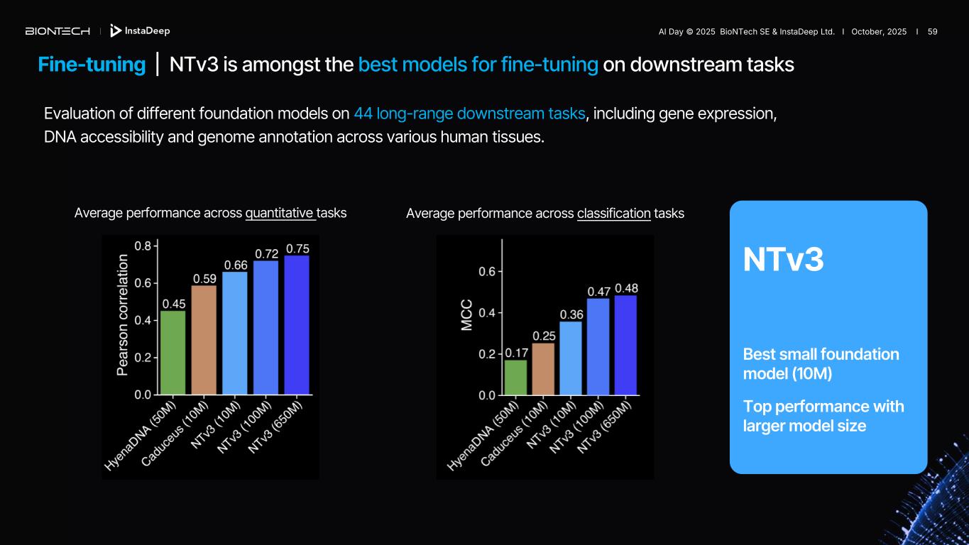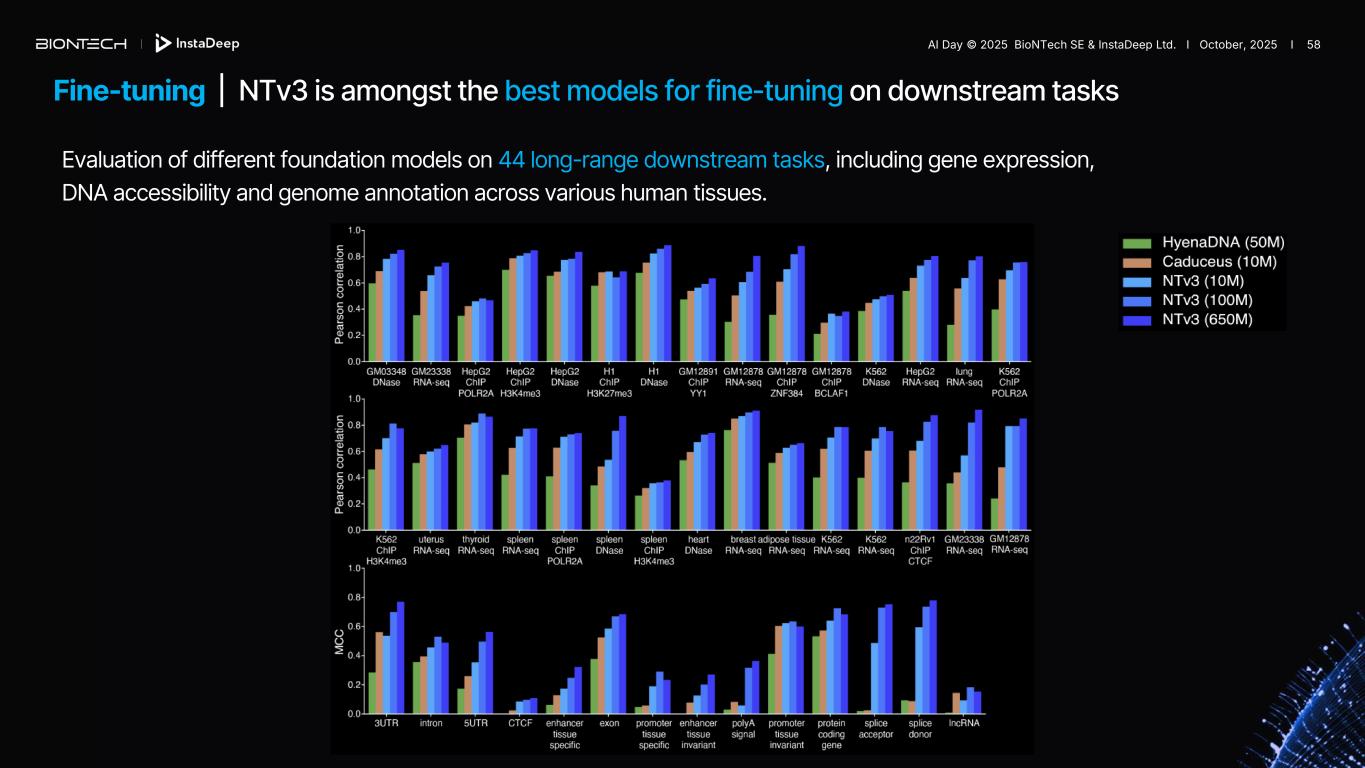 Fine-tuning | NTv3 is amongst the best models for fine-tuning on downstream tasks Evaluation of different foundation models on 44 long-range downstream tasks, including gene expression, DNA accessibility and genome annotation across various human tissues. AI Day © 2025 BioNTech SE & InstaDeep Ltd. I October, 2025 I 58