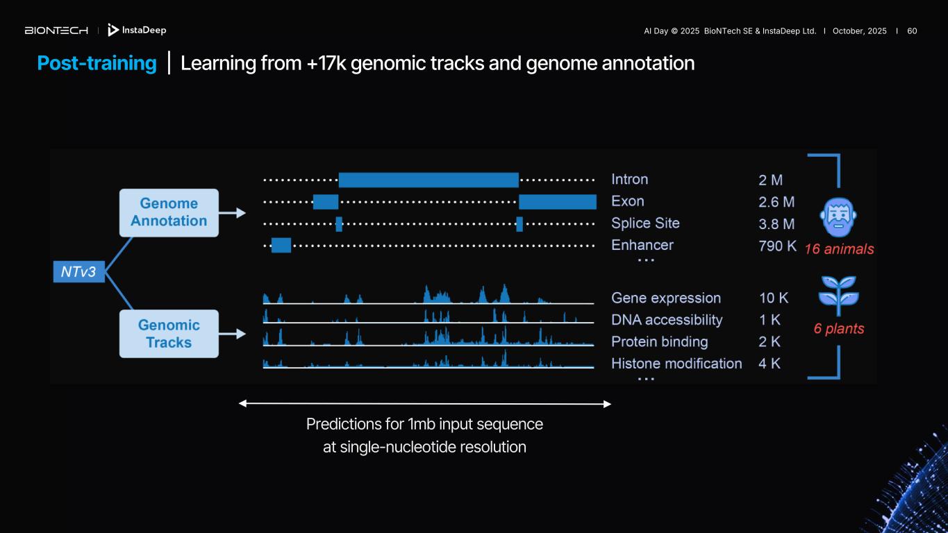 Post-training | Learning from +17k genomic tracks and genome annotation Predictions for 1mb input sequence at single-nucleotide resolution AI Day © 2025 BioNTech SE & InstaDeep Ltd. I October, 2025 I 60