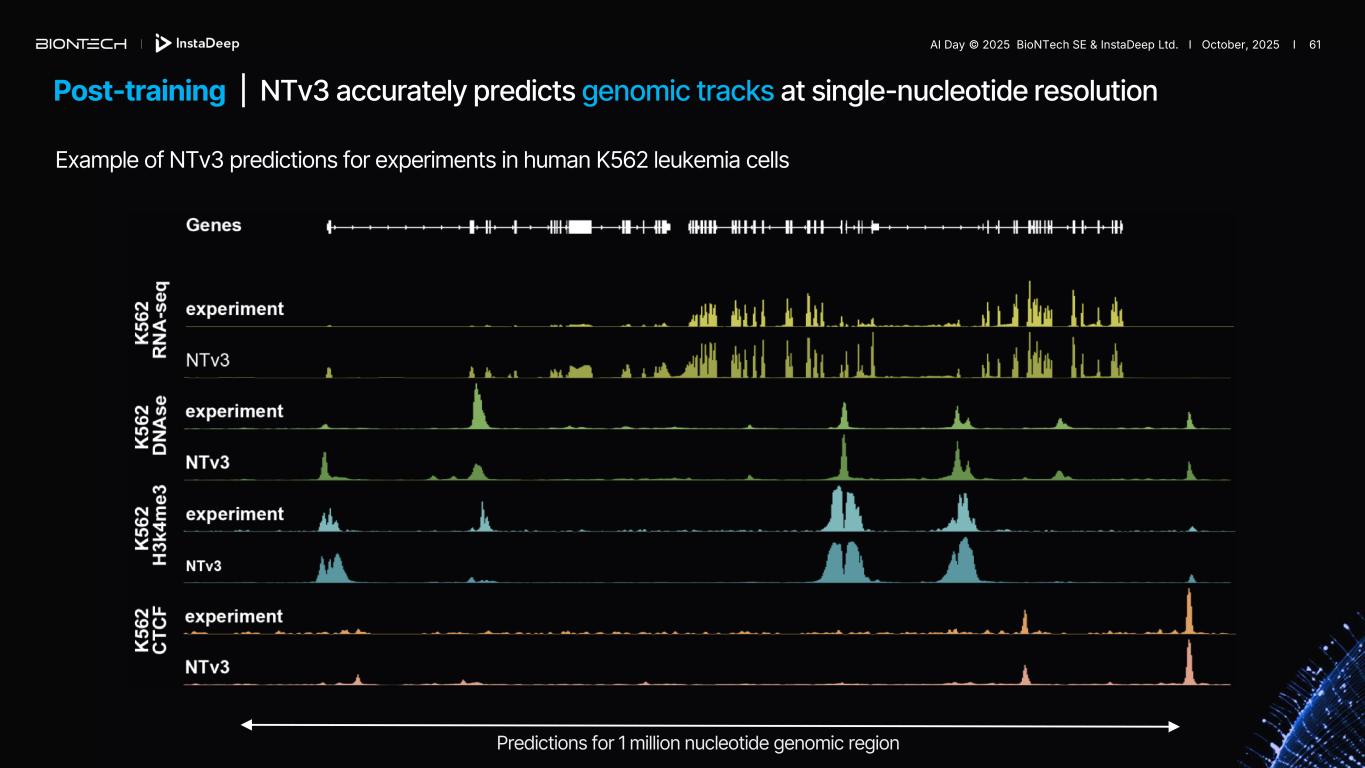 Post-training | NTv3 accurately predicts genomic tracks at single-nucleotide resolution Predictions for 1 million nucleotide genomic region Example of NTv3 predictions for experiments in human K562 leukemia cells AI Day © 2025 BioNTech SE & InstaDeep Ltd. I October, 2025 I 61