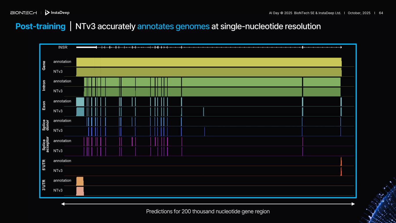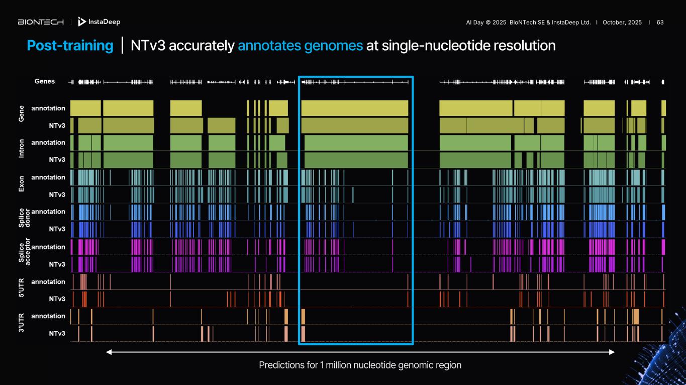 Post-training | NTv3 accurately annotates genomes at single-nucleotide resolution Predictions for 1 million nucleotide genomic region AI Day © 2025 BioNTech SE & InstaDeep Ltd. I October, 2025 I 63