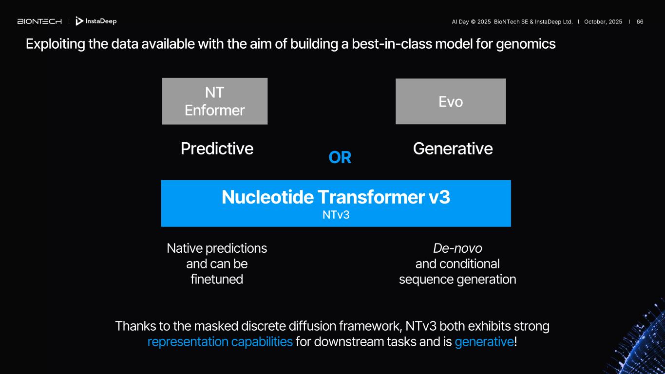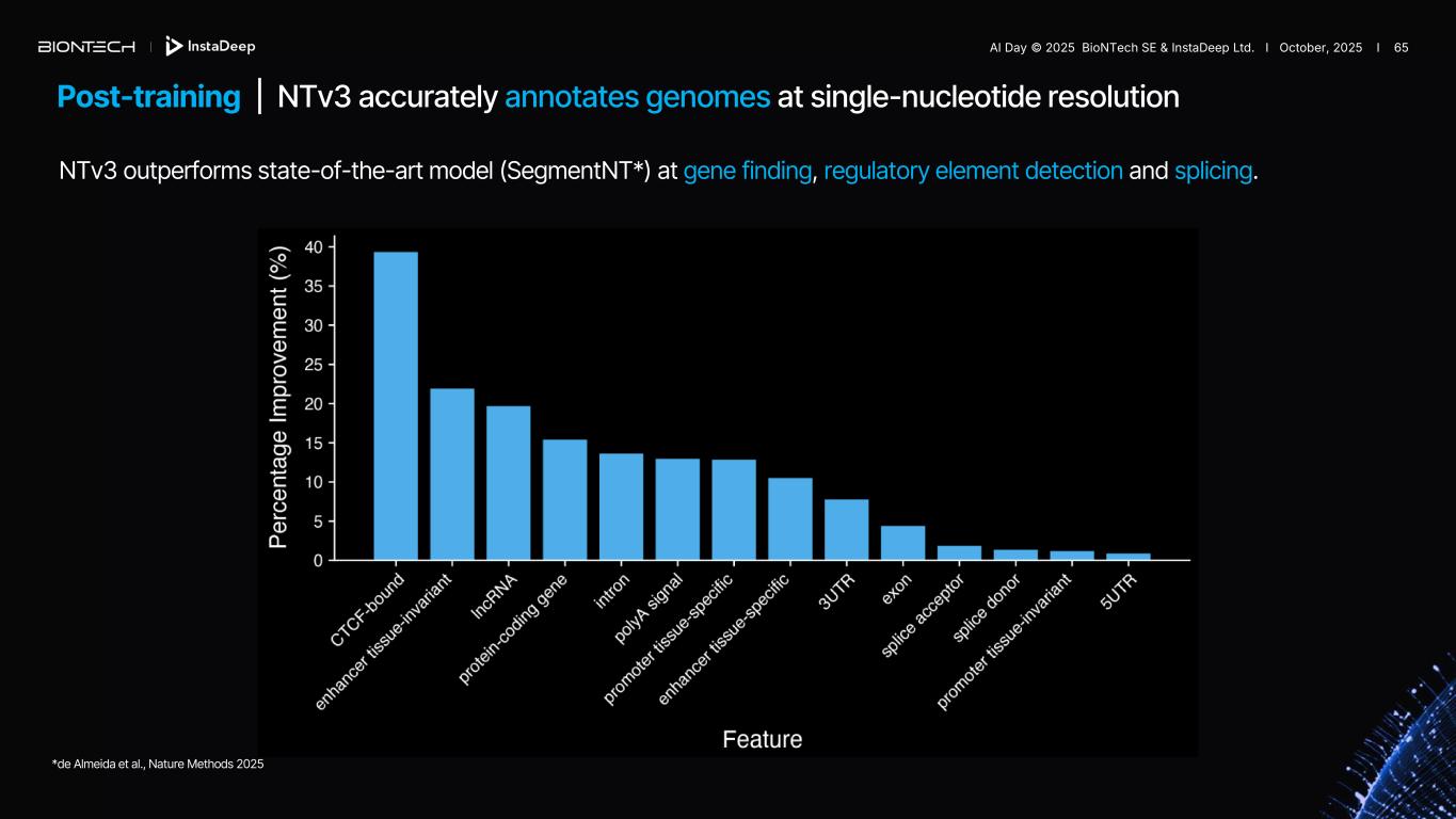 *de Almeida et al., Nature Methods 2025 Post-training | NTv3 accurately annotates genomes at single-nucleotide resolution NTv3 outperforms state-of-the-art model (SegmentNT*) at gene finding, regulatory element detection and splicing. AI Day © 2025 BioNTech SE & InstaDeep Ltd. I October, 2025 I 65