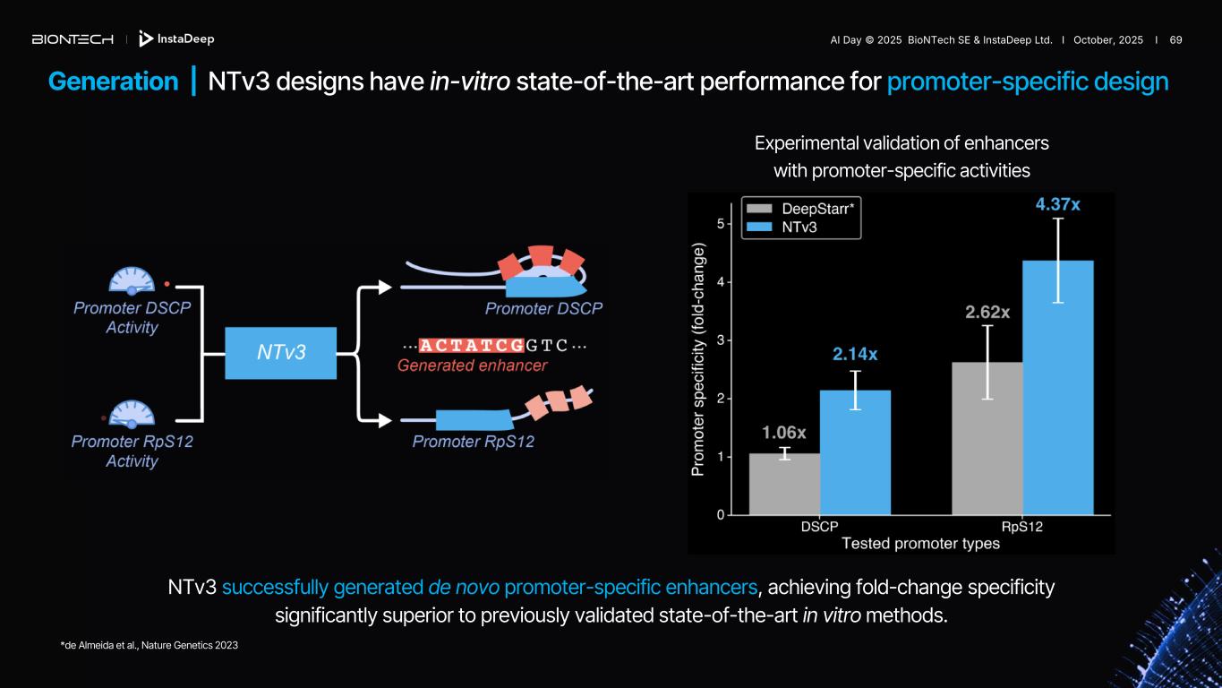 Generation | NTv3 designs have in-vitro state-of-the-art performance for promoter-specific design Experimental validation of enhancers with promoter-specific activities *de Almeida et al., Nature Genetics 2023 NTv3 successfully generated de novo promoter-specific enhancers, achieving fold-change specificity significantly superior to previously validated state-of-the-art in vitro methods. AI Day © 2025 BioNTech SE & InstaDeep Ltd. I October, 2025 I 69