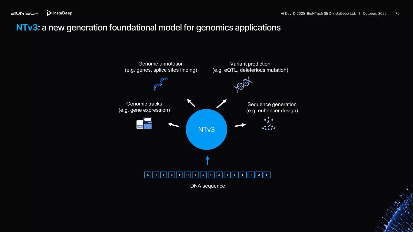 NTv3: a new generation foundational model for genomics applications Genomic tracks (e.g. gene expression) Genome annotation (e.g. genes, splice sites finding) Variant prediction (e.g. eQTL, deleterious mutation) Sequence generation (e.g. enhancer design) NTv3 DNA sequence A C T A T C T A G A T A GT G G AI Day © 2025 BioNTech SE & InstaDeep Ltd. I October, 2025 I 70