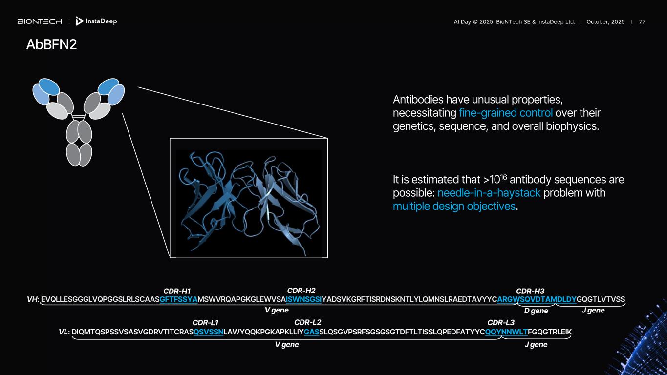 AbBFN2 CDR-H1 CDR-H2 CDR-H3 VH: EVQLLESGGGLVQPGGSLRLSCAASGFTFSSYAMSWVRQAPGKGLEWVSAISWNSGSIYADSVKGRFTISRDNSKNTLYLQMNSLRAEDTAVYYCARGWSQVDTAMDLDYGQGTLVTVSS D geneV gene J gene CDR-L1 CDR-L2 CDR-L3 VL: DIQMTQSPSSVSASVGDRVTITCRASQSVSSNLAWYQQKPGKAPKLLIYGASSLQSGVPSRFSGSGSGTDFTLTISSLQPEDFATYYCQQYNNWLTFGQGTRLEIK V gene J gene Antibodies have unusual properties, necessitating fine-grained control over their genetics, sequence, and overall biophysics. It is estimated that >1016 antibody sequences are possible: needle-in-a-haystack problem with multiple design objectives. AI Day © 2025 BioNTech SE & InstaDeep Ltd. I October, 2025 I 77