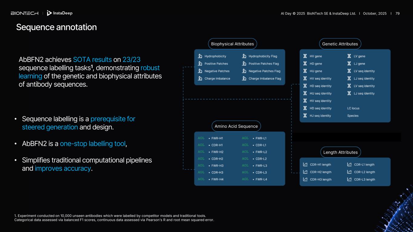 AbBFN2 achieves SOTA results on 23/23 sequence labelling tasks1, demonstrating robust learning of the genetic and biophysical attributes of antibody sequences. Sequence annotation • Sequence labelling is a prerequisite for steered generation and design. • AbBFN2 is a one-stop labelling tool, • Simplifies traditional computational pipelines and improves accuracy. 1. Experiment conducted on 10,000 unseen antibodies which were labelled by competitor models and traditional tools. Categorical data assessed via balanced F1 scores, continuous data assessed via Pearson’s R and root mean squared error. AI Day © 2025 BioNTech SE & InstaDeep Ltd. I October, 2025 I 79
