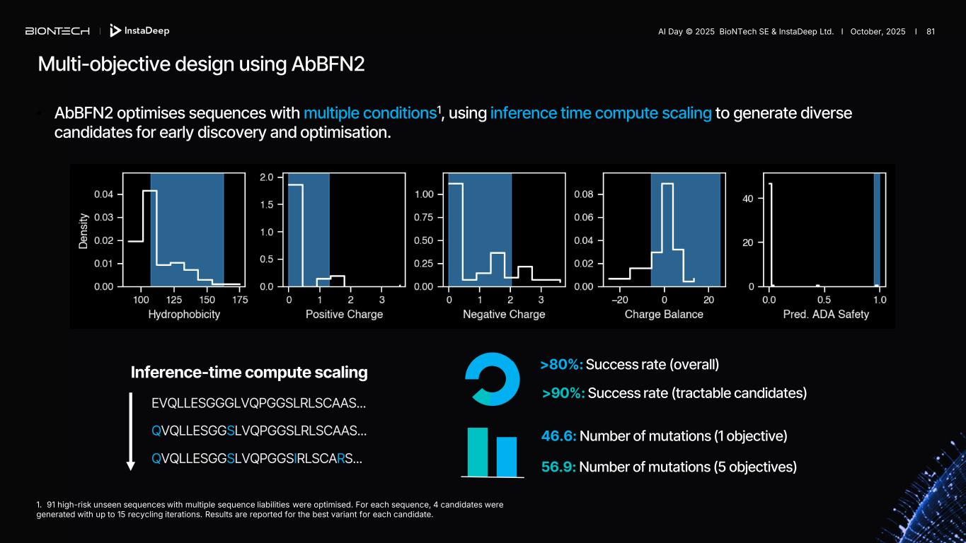 Using an unstable starting candidate, AbBFN2 is able to refine the interfaces and the total antibody to increase stability1, which allows more stable pairing, better storage, and higher expression levels. Stabilisation of existing antibodies 1. Interface energies are calculated using the Rosetta Protein Modelling Suite. 5,000 samples are generated in each case and compared to a background distribution 5,000 randomly picked unseen antibodies. AI Day © 2025 BioNTech SE & InstaDeep Ltd. I October, 2025 I 80