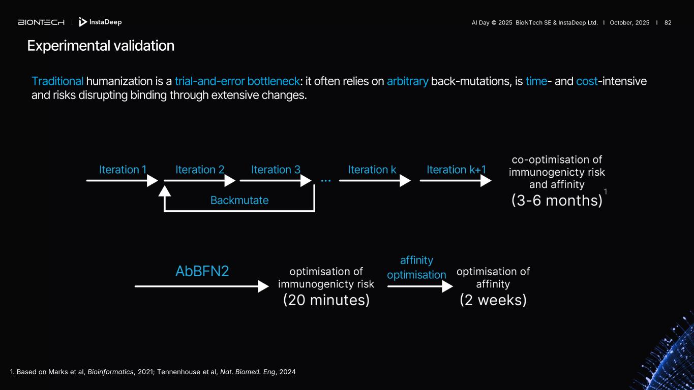 Experimental validation Traditional humanization is a trial-and-error bottleneck: it often relies on arbitrary back-mutations, is time- and cost-intensive and risks disrupting binding through extensive changes. 1. Based on Marks et al, Bioinformatics, 2021; Tennenhouse et al, Nat. Biomed. Eng, 2024 1 AI Day © 2025 BioNTech SE & InstaDeep Ltd. I October, 2025 I 82