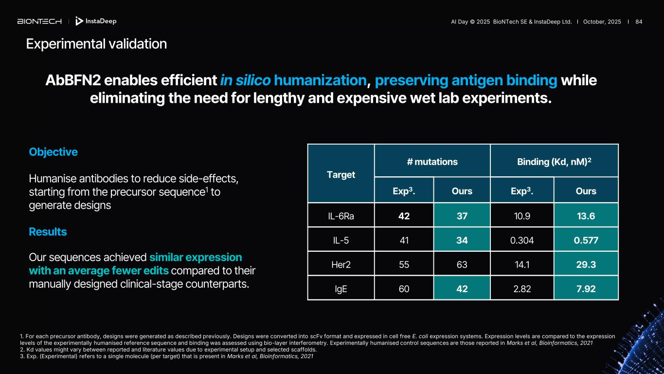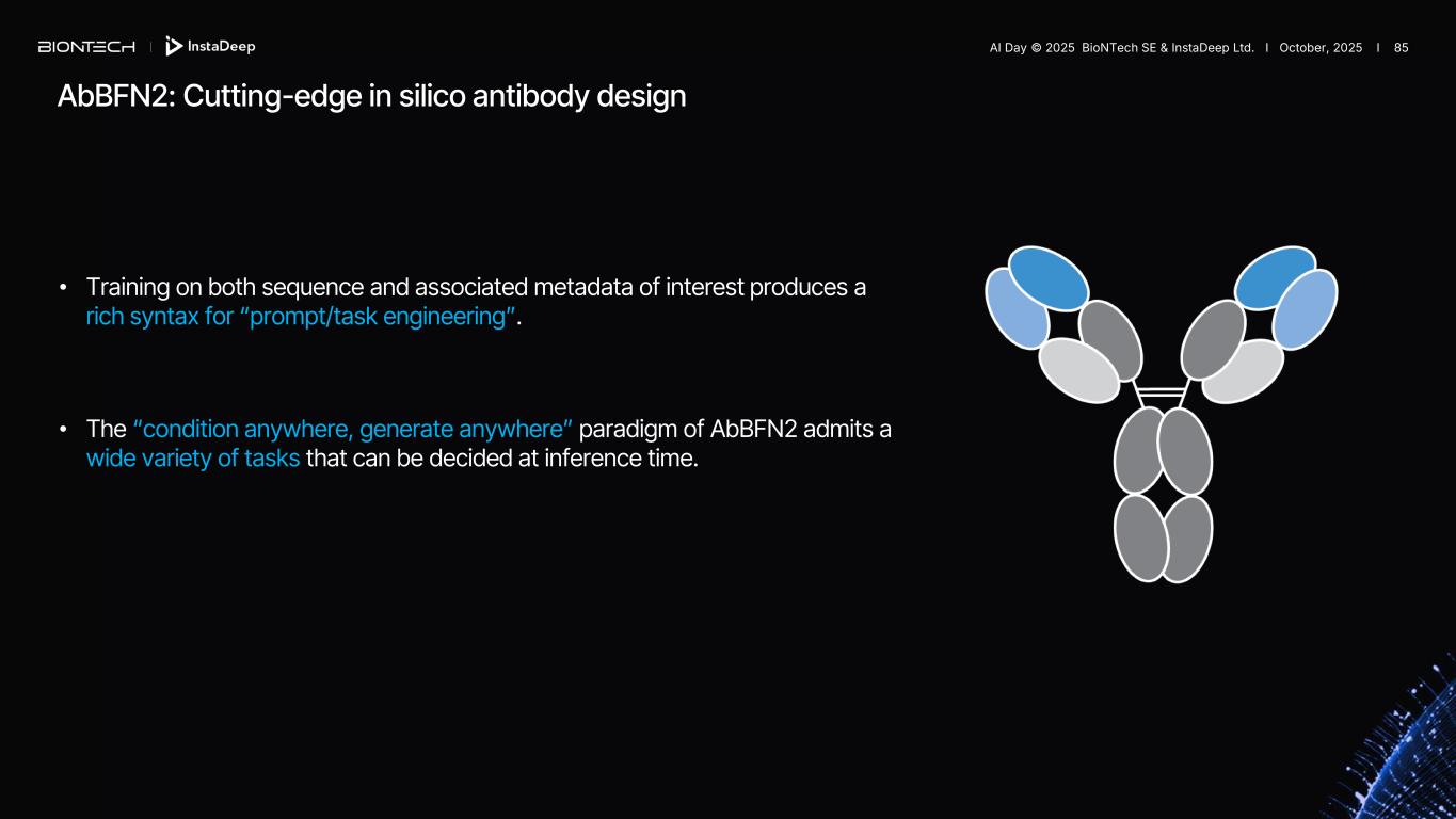Experimental validation Objective Humanise antibodies to reduce side-effects, starting from the precursor sequence1 to generate designs Results Our sequences achieved similar expression with an average fewer edits compared to their manually designed clinical-stage counterparts. 1. For each precursor antibody, designs were generated as described previously. Designs were converted into scFv format and expressed in cell free E. coli expression systems. Expression levels are compared to the expression levels of the experimentally humanised reference sequence and binding was assessed using bio-layer interferometry. Experimentally humanised control sequences are those reported in Marks et al, Bioinformatics, 2021 2. Kd values might vary between reported and literature values due to experimental setup and selected scaffolds. 3. Exp. (Experimental) refers to a single molecule (per target) that is present in Marks et al, Bioinformatics, 2021 Target # mutations Binding (Kd, nM)2 Exp3. Ours Exp3. Ours IL-6Ra 42 37 10.9 13.6 IL-5 41 34 0.304 0.577 Her2 55 63 14.1 29.3 IgE 60 42 2.82 7.92 AbBFN2 enables efficient in silico humanization, preserving antigen binding while eliminating the need for lengthy and expensive wet lab experiments. AI Day © 2025 BioNTech SE & InstaDeep Ltd. I October, 2025 I 84
