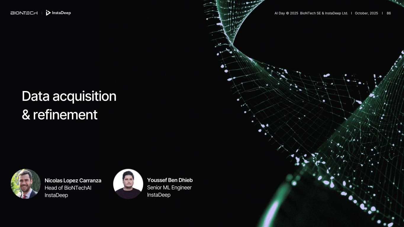 Data acquisition & refinement Nicolas Lopez Carranza Head of BioNTechAI InstaDeep Youssef Ben Dhieb Senior ML Engineer InstaDeep AI Day © 2025 BioNTech SE & InstaDeep Ltd. I October, 2025 I 86
