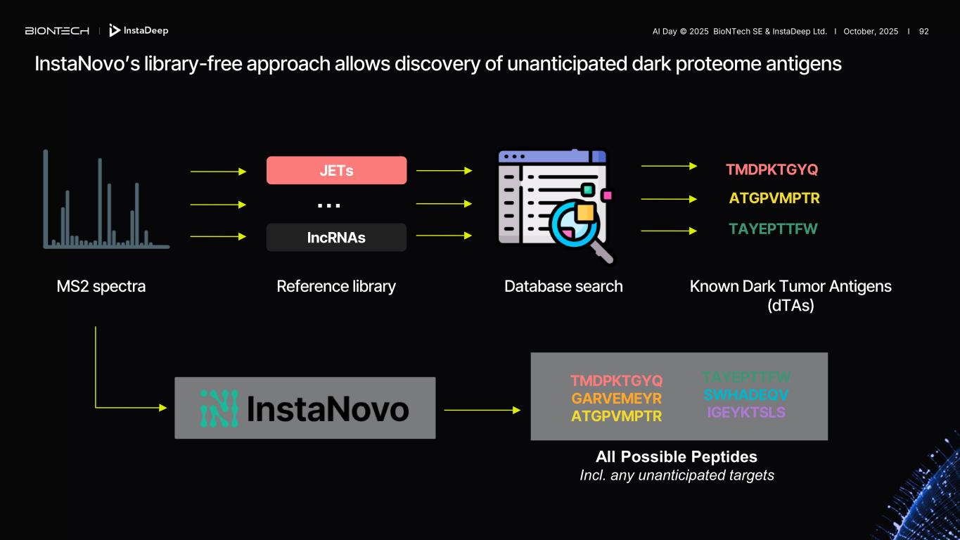 Database searchReference library JETs lncRNAs Known Dark Tumor Antigens (dTAs) TMDPKTGYQ TAYEPTTFW ATGPVMPTR MS2 spectra TMDPKTGYQ GARVEMEYR ATGPVMPTR All Possible Peptides Incl. any unanticipated targets TAYEPTTFW SWHADEQV IGEYKTSLS … InstaNovo’s library-free approach allows discovery of unanticipated dark proteome antigens AI Day © 2025 BioNTech SE & InstaDeep Ltd. I October, 2025 I 92