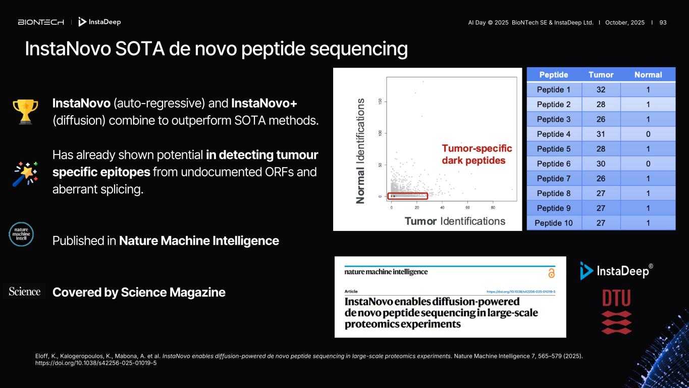 InstaNovo technology enables de novo peptide sequencing to explore the 'dark proteome' and uncover unknown proteins in cancer. Internal AI Day © 2025 BioNTech SE & InstaDeep Ltd. I October, 2025 I 91