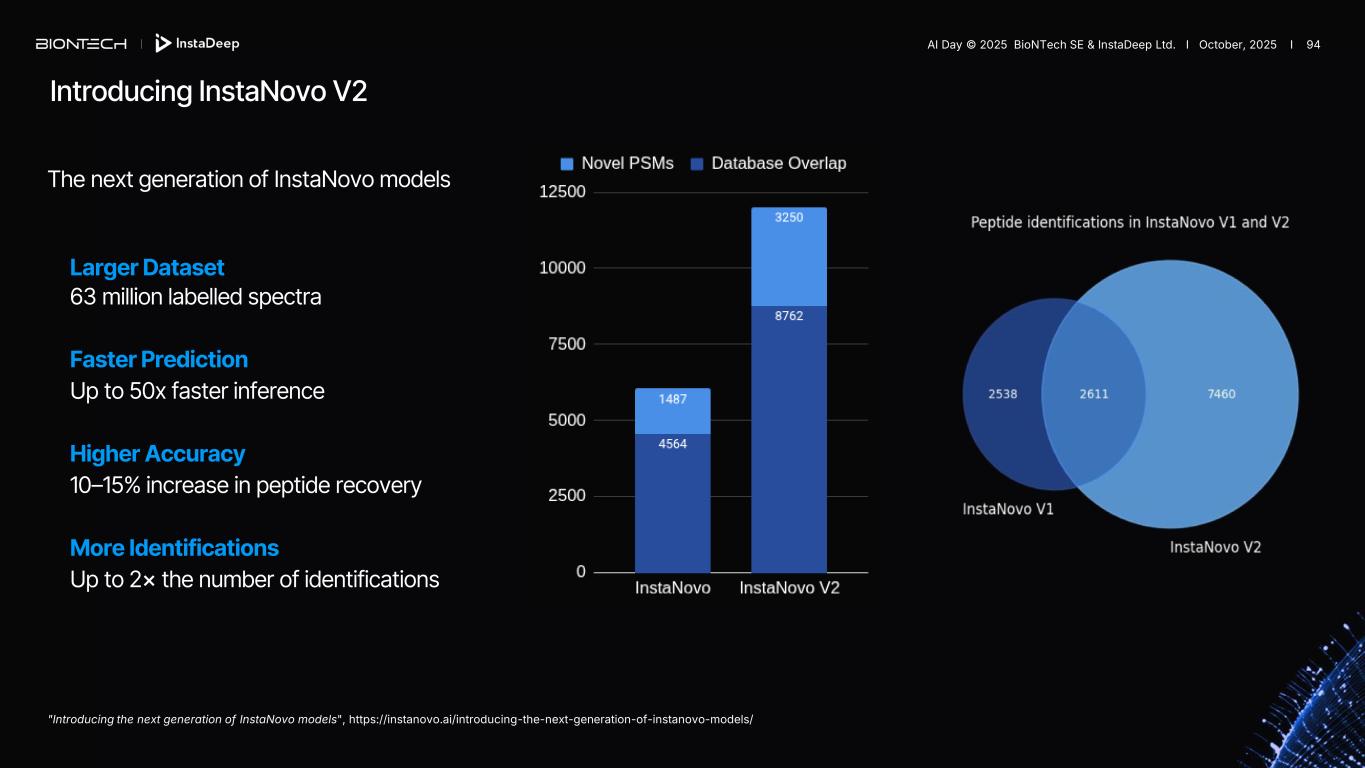 Introducing InstaNovo V2 Larger Dataset 63 million labelled spectra Faster Prediction Up to 50x faster inference Higher Accuracy 10–15% increase in peptide recovery More Identifications Up to 2× the number of identifications "Introducing the next generation of InstaNovo models", https://instanovo.ai/introducing-the-next-generation-of-instanovo-models/ The next generation of InstaNovo models AI Day © 2025 BioNTech SE & InstaDeep Ltd. I October, 2025 I 94