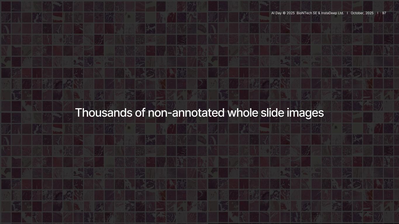 97 I AI Day © 2025 InstaDeep Ltd. & BioNTech SE I October, 2025 Thousands of non-annotated whole slide images AI Day © 2025 BioNTech SE & InstaDeep Ltd. I October, 2025 I 97